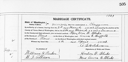 Harlan Burdine "Bert" Blake and Anna Elaine (Allison) Griffith were married March 4, 1903, in Tacoma, Pierce Co., WA, in the presence of William H. Parker and B. F. Allison. B. F. is Anna's brother.