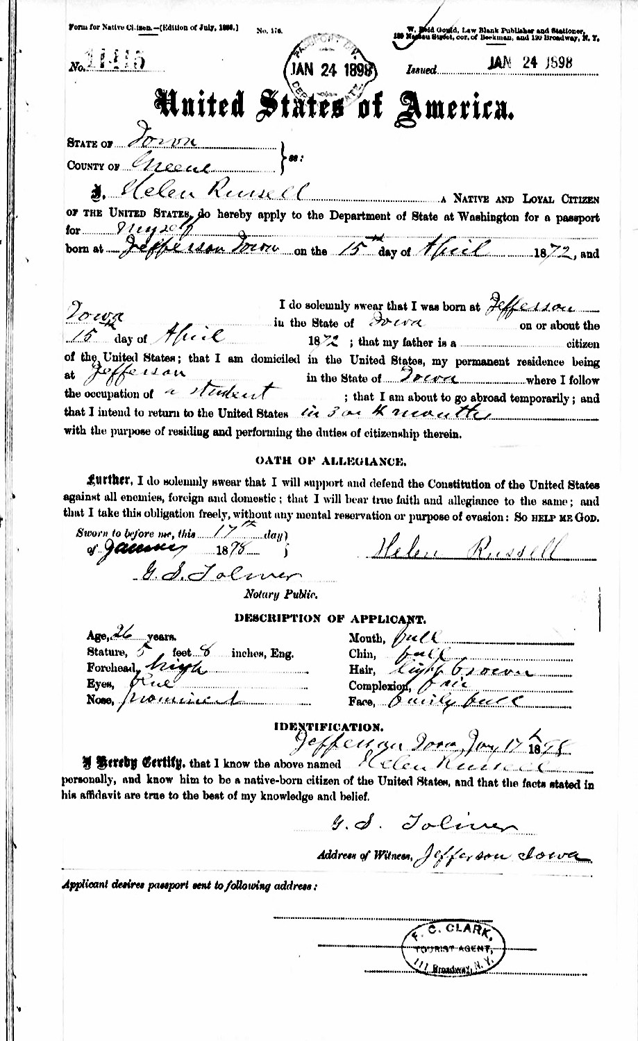 In 1898, Helen B. "Nellie" Russell applied for a U. S. Passport. The age she reported was one year younger than actual.