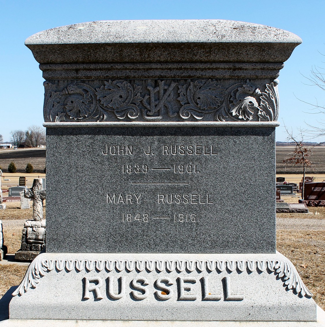 John J. Russell and Mary C. (McDuffie ) Russell are buried in Jefferson Cemetery, Jefferson, Grant Twp., Greene Co., IA. Thanks to Find-A-Grave for making this image available.