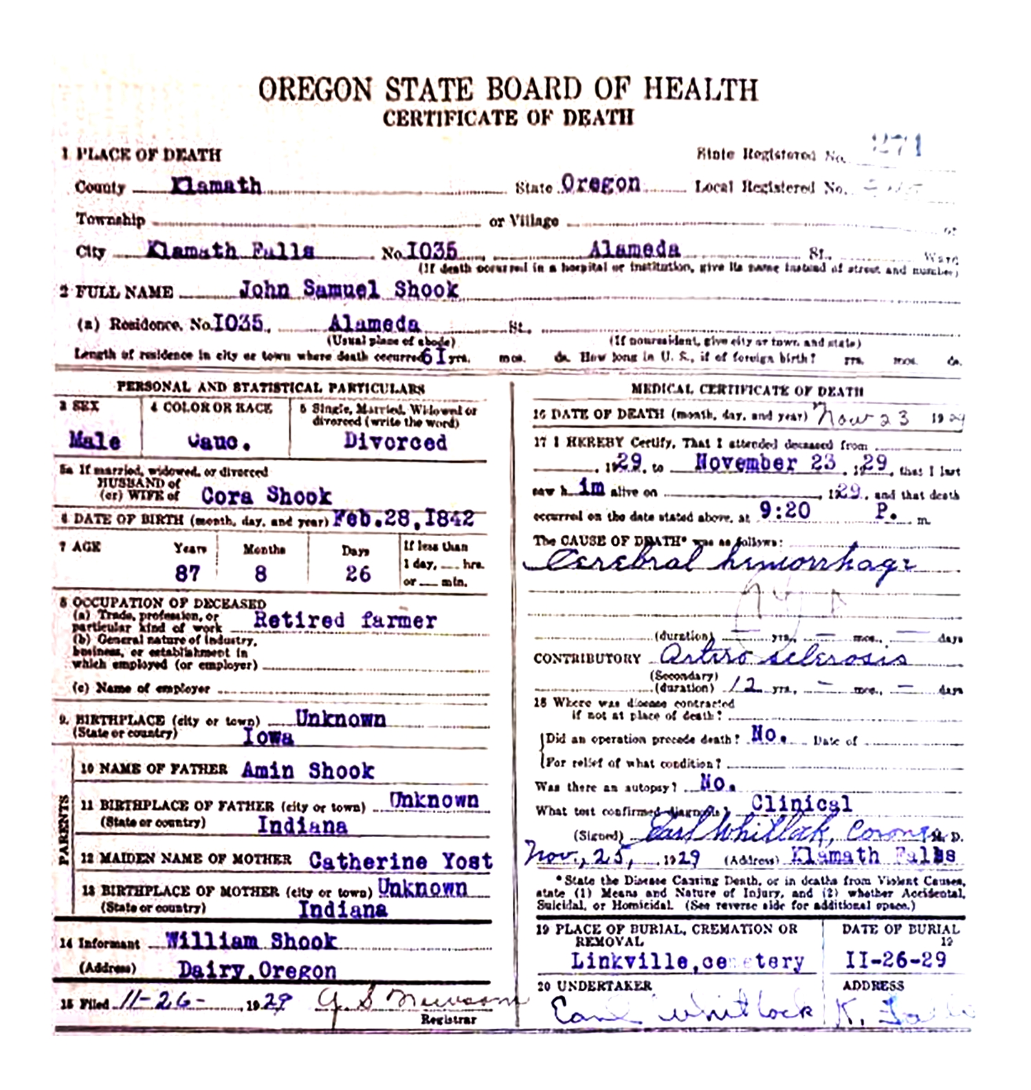 John Samuel Shook was born February 29, 1841 , in Salt Creek Twp., Davis Co., IA, and died November 23, 1929 , in Klamath Falls, Klamath Co., OR, at age 88. Buried in Linkville Pioneer Cemetery, Klamath Falls, Klamath Co., OR. He is the son of Amon Shook of Dearborn Co., IN, and Katherine Yost of Indiana.