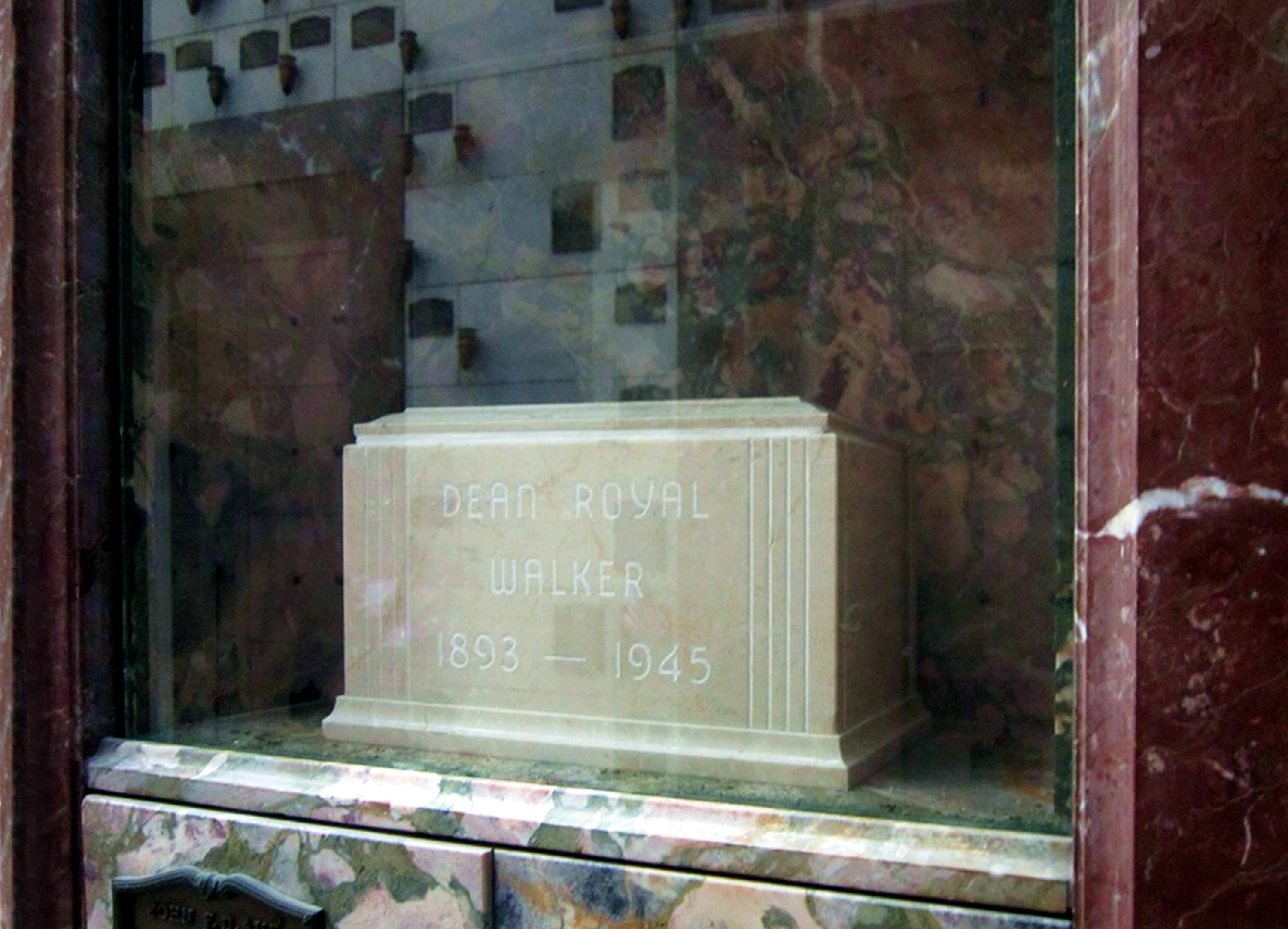 Dean Royal Walker is buried in Rose Hills Memorial Park, Whittier, Los Angeles Co., CA.. Thanks to Find-A-Grave for making these images available.