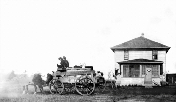 Frances Willard Werner and her beau, Walter Parker Johnson, about April, 1918, ND. The person on the far side of the wagon is not identified. The left two photos of the front and back courtesy of Kay Koslan. The reverse of the photo states they are driving from home in Hazen, out to the ranch (called Riverside Ranch). The Ranch was a few miles outside of Beulah. Since Walter enlisted in the Army at Center on March 29, 1918, and was sent overseas on May 3, 1918, the picture would have been taken in April, 1918.