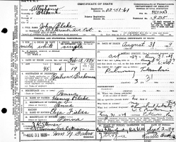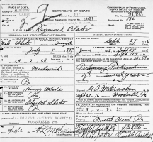 John Blake died August 31, 1929, at the home of his sister, Alice Sterner, in Turtle Creek, Wilkens Twp., Allegheny Co., PA, at age 45. Buried in Odd Fellows Cemetery.