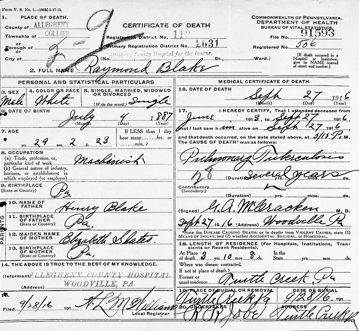 Raymond L. Blake died September 27, 1916, at the Allegheny County Hospital for the Insane, Collier Twp., Allegheny Co., PA (age 29). Buried in I. O. O. F. Memorial Cemetery, Rockhill Furnace, Huntingdon Co., PA.