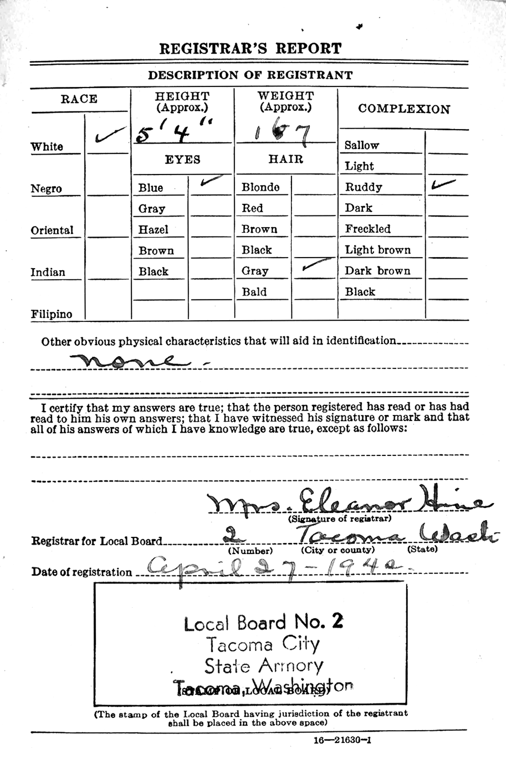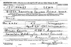 The WWII Draft Registration Report taken on April 27, 1942, shows Henry Lewis (age 55) born April 26, 1887, in Waupaca, WI, works for Coca-Cola Bottling Co., and is living at 818 South Anderson, Tacoma, Pierce Co., WA.