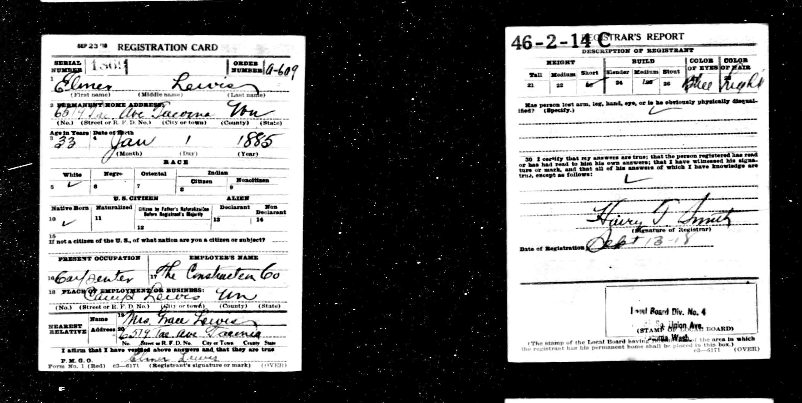 The 1920 U. S. Census taken on January 3, 1920, shows Elmer Lewis (age 36) born in Wisconsin to Sweden and Denmark-born parents is a cigar maker owning his home and living in 6519 Tacoma Ave., Ward 5, Tacoma, Pierce Co., WA. Living with him is his wife Grace Lewis (age 34) born in Wisconsin to Wisconsin-born parents. Also living there is their son Eugene Lewis (age 6) born in Washington to Wisconsin-born parents.