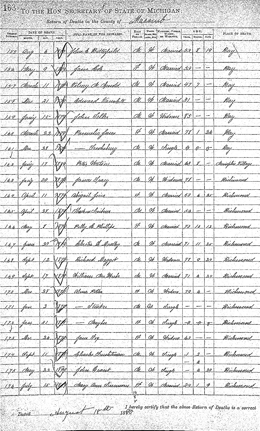 William McKeeby died September 17, 1879, in Richmond Twp., Macomb Co., MI, at age 73. Buried in Memphis Cemetery, Memphis, Richmond Twp., Macomb Co., MI.