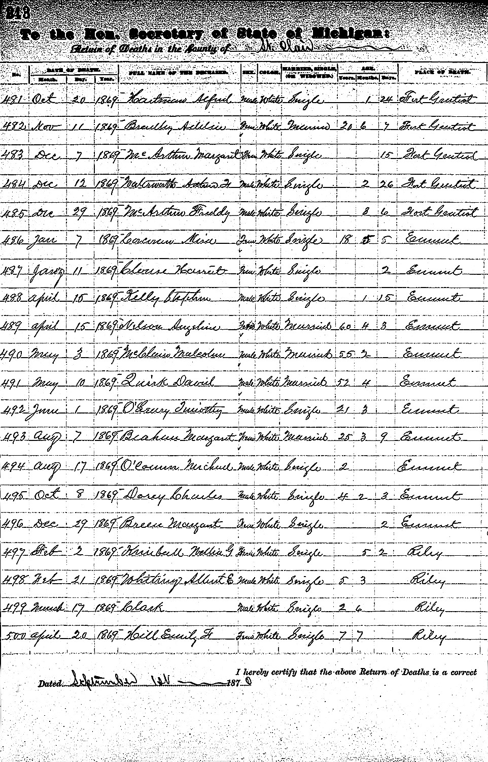 In the Early death Records for St. Clair County MI 1869 list Francis E.
