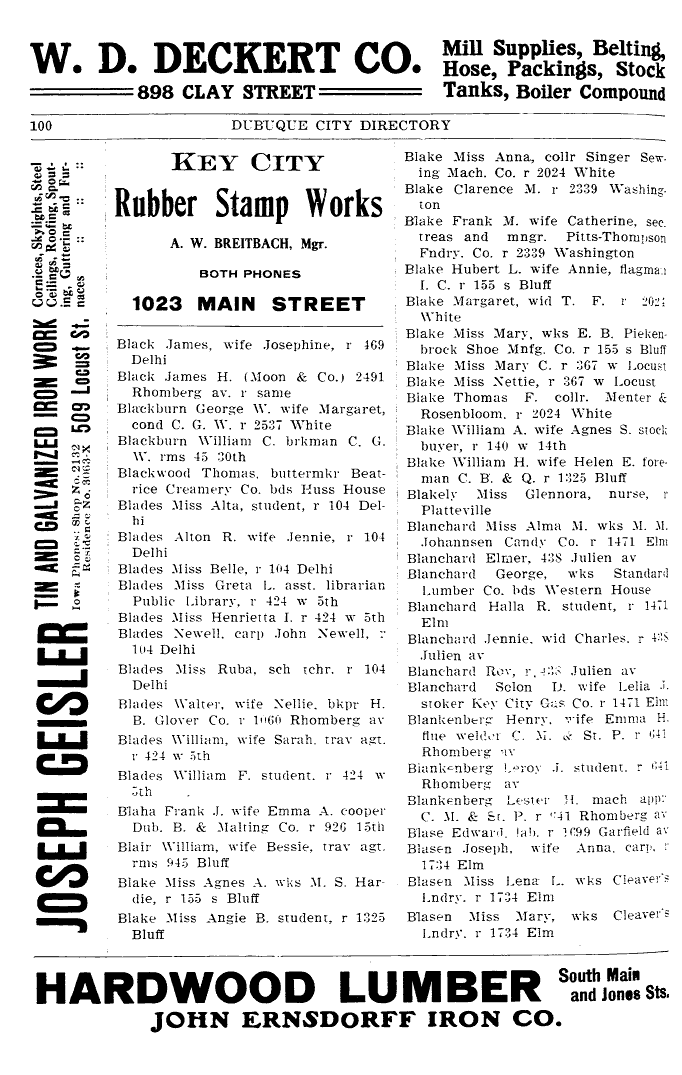 The 1915 Iowa State Census shows Hubert Blake (age 49) born in Illinois to Pennsylvania-born parents and having lived in Iowa for 40 years is a Watchman owning his own home worth $2,000 and is living in the 1st Ward, City of Dubuque, Dubuque Co., IA. Living with him is Anna Blake (age 48) born in Iowa to Iowa-born parents and having lived in Iowa for 48 years. Also living there is Dorothy Blake (age 12) born in Iowa to Illinois and Iowa-born parents.