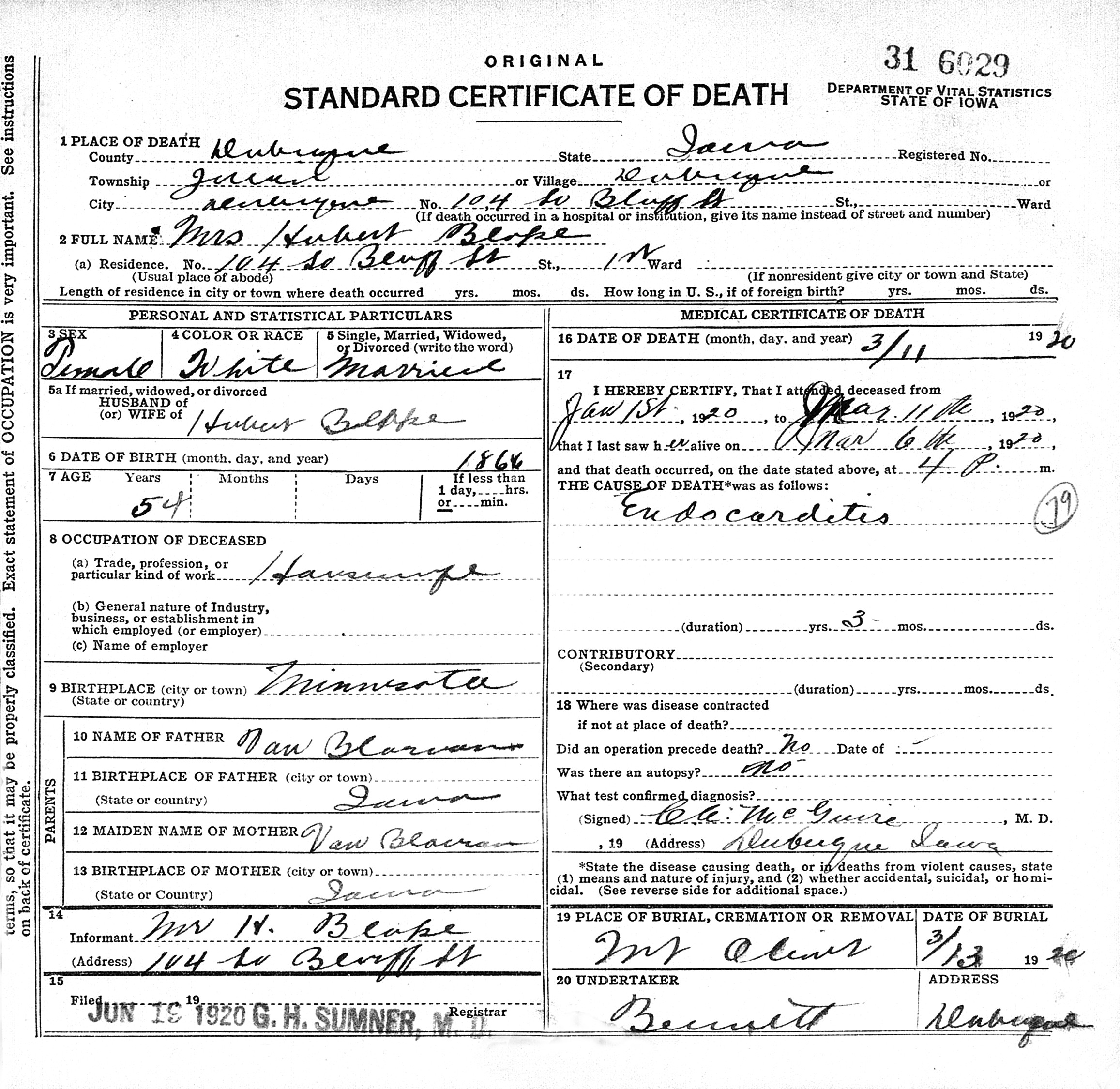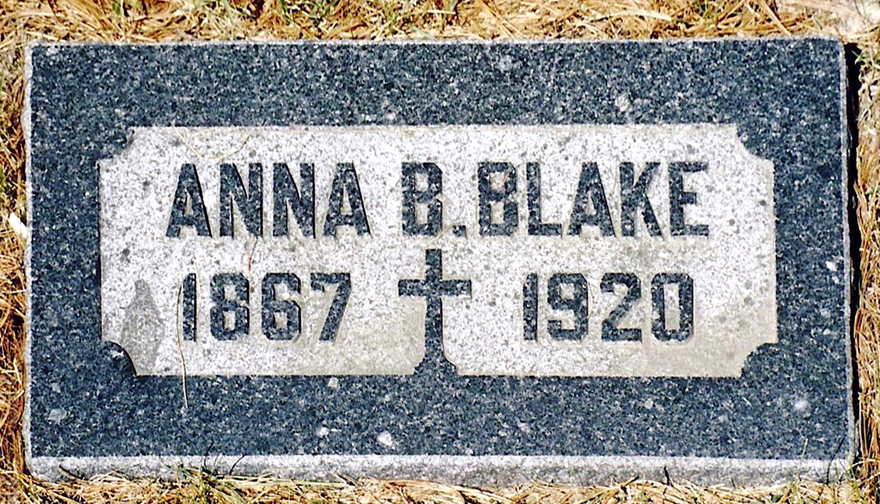 Bridget Ann "Annie" (Van Blaricom) Blake died Thursday, March 11, 1920, at 4 p.m., at her home, 104 South Bluff Street, 1st Ward, City of Dubuque, Dubuque Co., IA, at age 52. Buried in Mount Olivet Cemetery, Key West, Dubuque Co., IA.