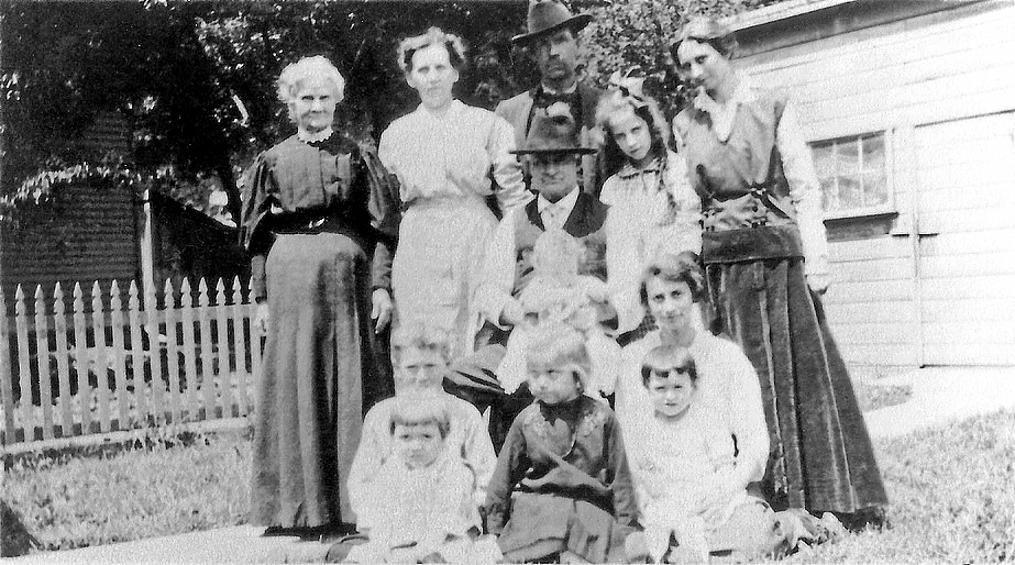 Back Row: Catherine Van Blaricom, Bridget Ann "Annie" Blake, David Van Blaricom, Dorothy Blake, Mary Lange; sitting Hubert Blake & Hubert Lange on lap; Front Row on Grass: Probably James Van Blaricom holding Lois Engel, Catherine Van Blaricom, Lois Engel holding Harriet Engel.