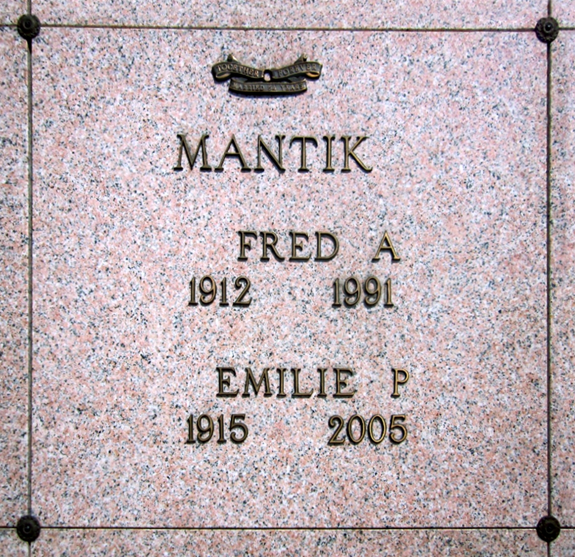 Frederick August "Fred" Mantik and Emilie Pauline (Paulson) Mantik are entombed in the Garden of Eternal Rest, Restlawn Memorial Park, Wausau, Marathon Co., WI. Thanks to Find-A-Grave for making this picture available.