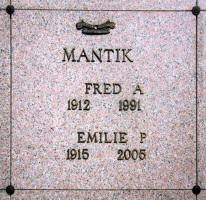 - Emilie Pauline Paulson: Born October 22, 1915, in Mosinee, Marathon Co., WI; Died November 24, 2005, at Memorial Nursing and Rehabilitation Center, Medford, Taylor Co., WI (age 90). Entombed in the Garden of Eternal Rest, Restlawn Memorial Park, Wausau, Marathon Co., WI. Married June 4, 1938, at the Christian Assembly Church, Wausau, Marathon Co., WI, to Frederick August "Fred" Mantik: Born November 7, 1912, in Wisconsin; Died April 25, 1991, in Marathon Co., WI (age 78). Entombed in the Garden of Eternal Rest, Restlawn Memorial Park, Wausau, Marathon Co., WI.