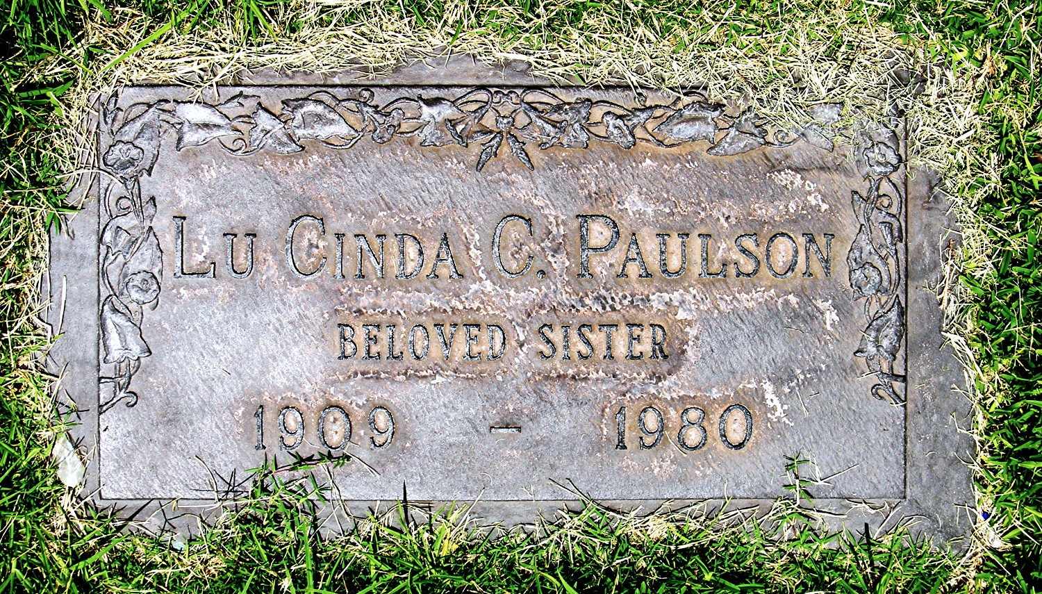 Lucinda Christina Paulson is buried in Pierce Brothers Valhalla Memorial Park, North Hollywood, Los Angeles Co., CA. Thanks to Find-A-Grave for making this picture available.