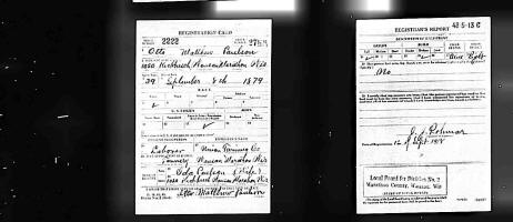 The WWI Draft Registration Report dated September 12, 1918, shows Otto Matthew Paulson (age 39) is a Laborer at Union Tanning Co., Wausau, Marathon Co., WI. His nearest relative is his wife, Ida Paulson.