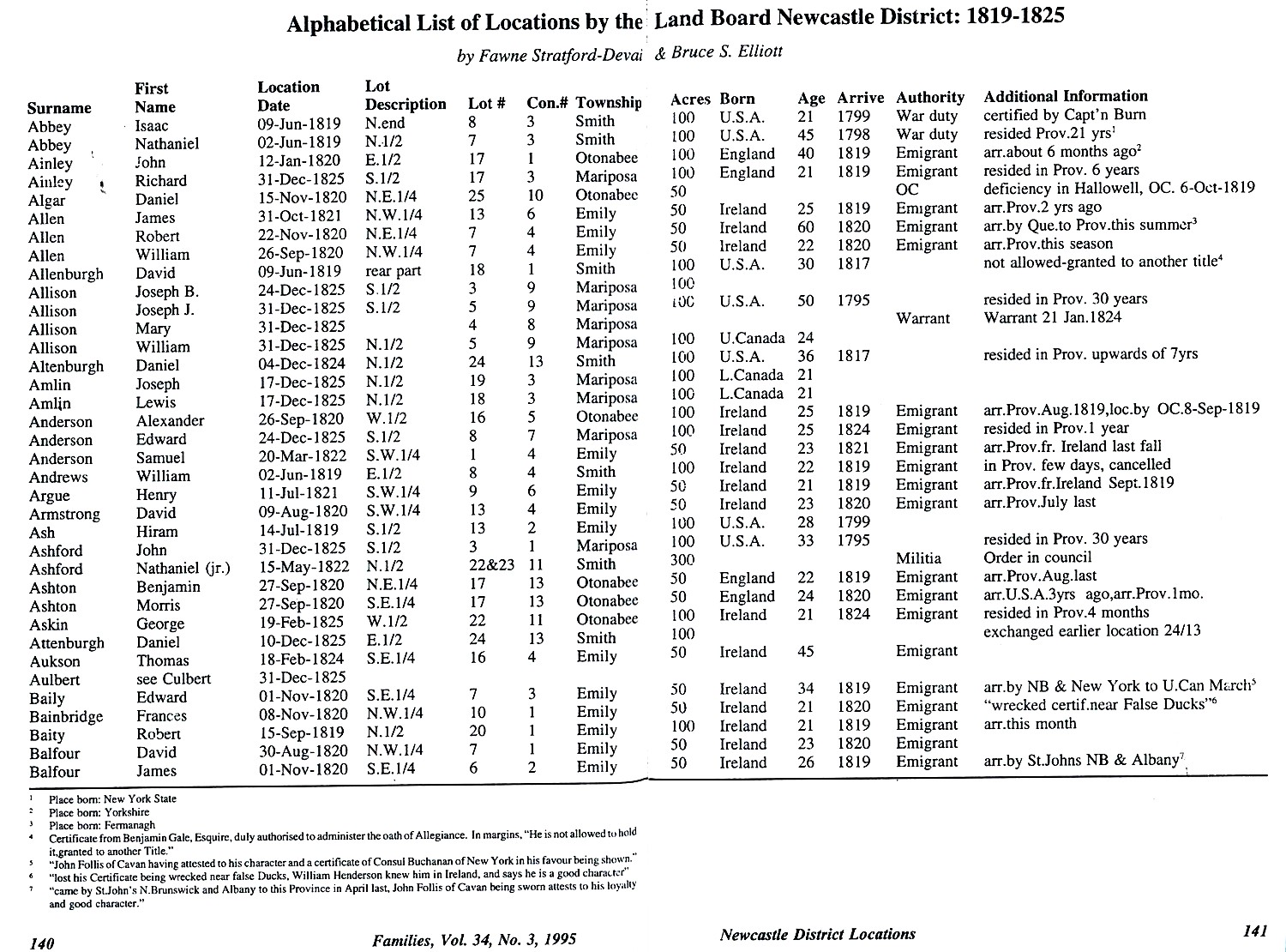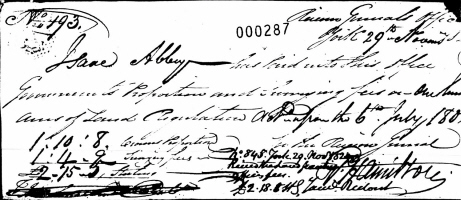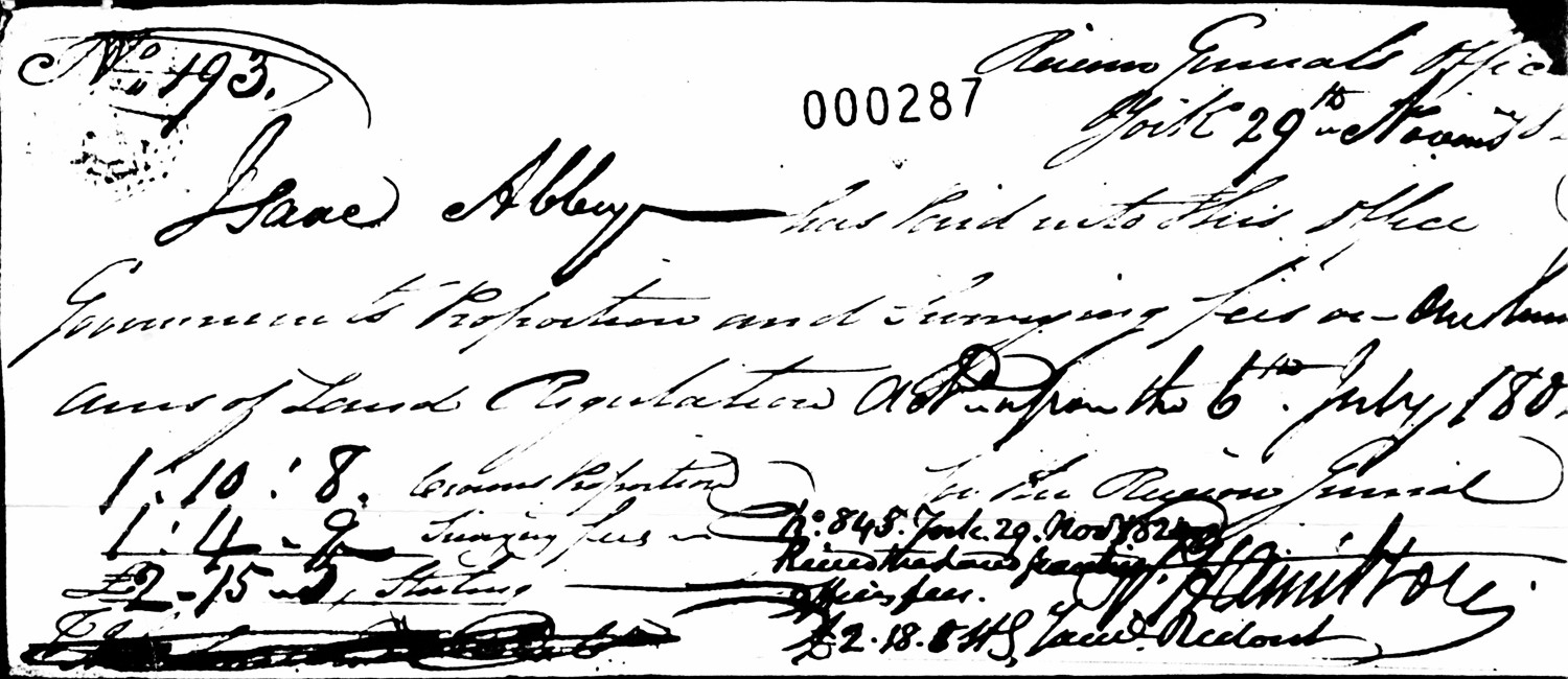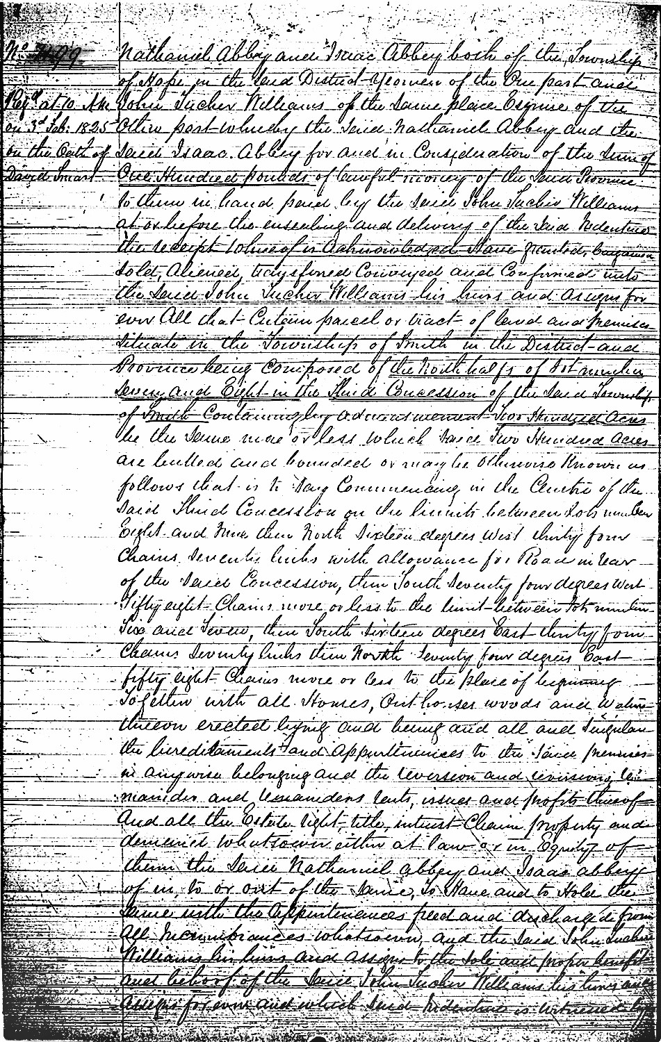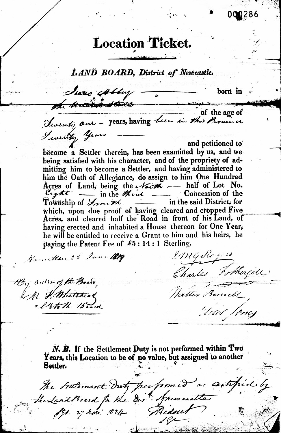 On June 23, 1819, Isaac Phineas Abbey petitioned to be recognized as a Settler, and was assigned One Hundred Acres of Land in the North Half of Lot No. Eight, in the Third Concession of Smith Township, Newcastle District, Upper Canada. He stated that he was age 21, was born in the United States, and had been in this Province 20 years. The Final Settlement Date was November 27, 1824.