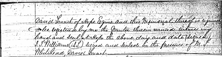 - Henry Jones Irwin: Born July 13, 1834, in Hope Twp., Durham Co., Newcastle Dist., Upper Canada ; Died July 7, 1929, on Bruton Street, Port Hope, Hope Twp., Durham Co., Ontario, Canada (age 94). Buried in Welcome United Church Cemetery, Welcome, Northumberland Co., Ontario, Canada. Married January 3, 1860, in Port Hope, Northumberland and Durham Co., Canada West, to Abigail Bebee: Born June 1835 in Ontario, Canada; Died resulting from a broken hip November 12, 1925, on Bruton Street, Port Hope, Hope Twp., Durham Co., Ontario, Canada (age 90). Buried in Welcome United Church Cemetery, Welcome, Northumberland Co., Ontario, Canada.