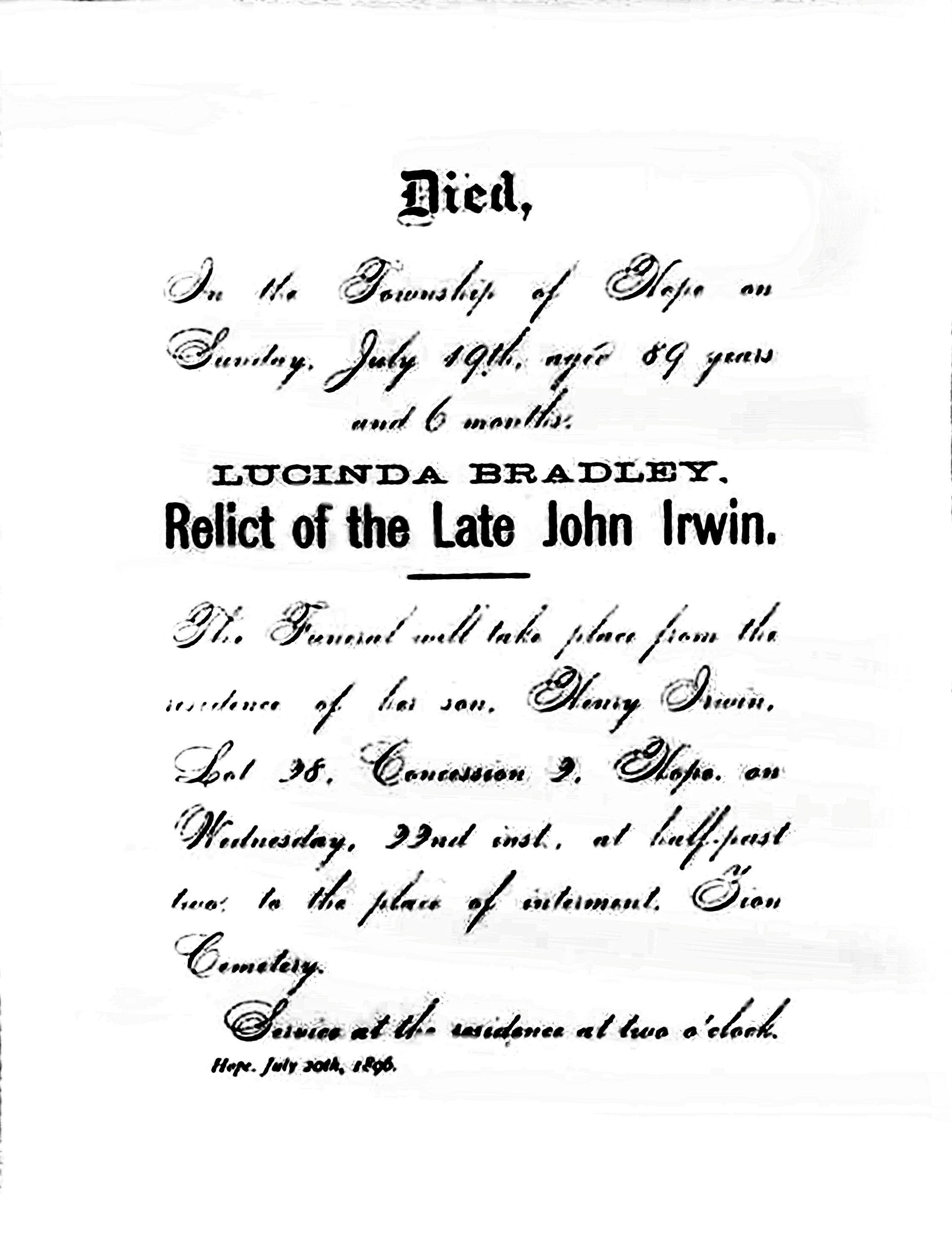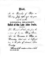 - Lucinda Mathilda Irwin: Born December 29, 1839, in Hope Twp., Durham Co., Newcastle Dist., Upper Canada ; Died May 21, 1912, in Lot 2, Concession 3, Hope Twp., Durham Co., Ontario, Canada (age 72). Buried in Welcome United Church Cemetery, Northumberland Co., Ontario, Canada. Married June 5, 1860, in Canada West to Talman Bebee: Born February 27, 1832, in Port Hope, Durham Co., Upper Canada; Died from a cerebral hemorrhage March 4, 1913, in Lot 24, Concession 3, Hope Twp., Durham Co., Ontario, Canada (age 81). Buried in Welcome United Church Cemetery, Northumberland Co., Ontario, Canada.
