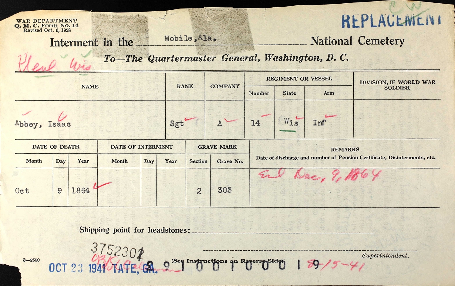 When a replacement gravestone was ordered and furnished in 1941, the year of Isaac Abbey's death was mistakenly shown as 1864. It should have been 1865, as evidenced by the original death document shown above. This mistake has perpetuated the belief that he died in 1864. He is buried in Section 2, Grave 303, Mobile National Cemetery, Mobile, Mobile Co., AL. The records there have not been corrected.