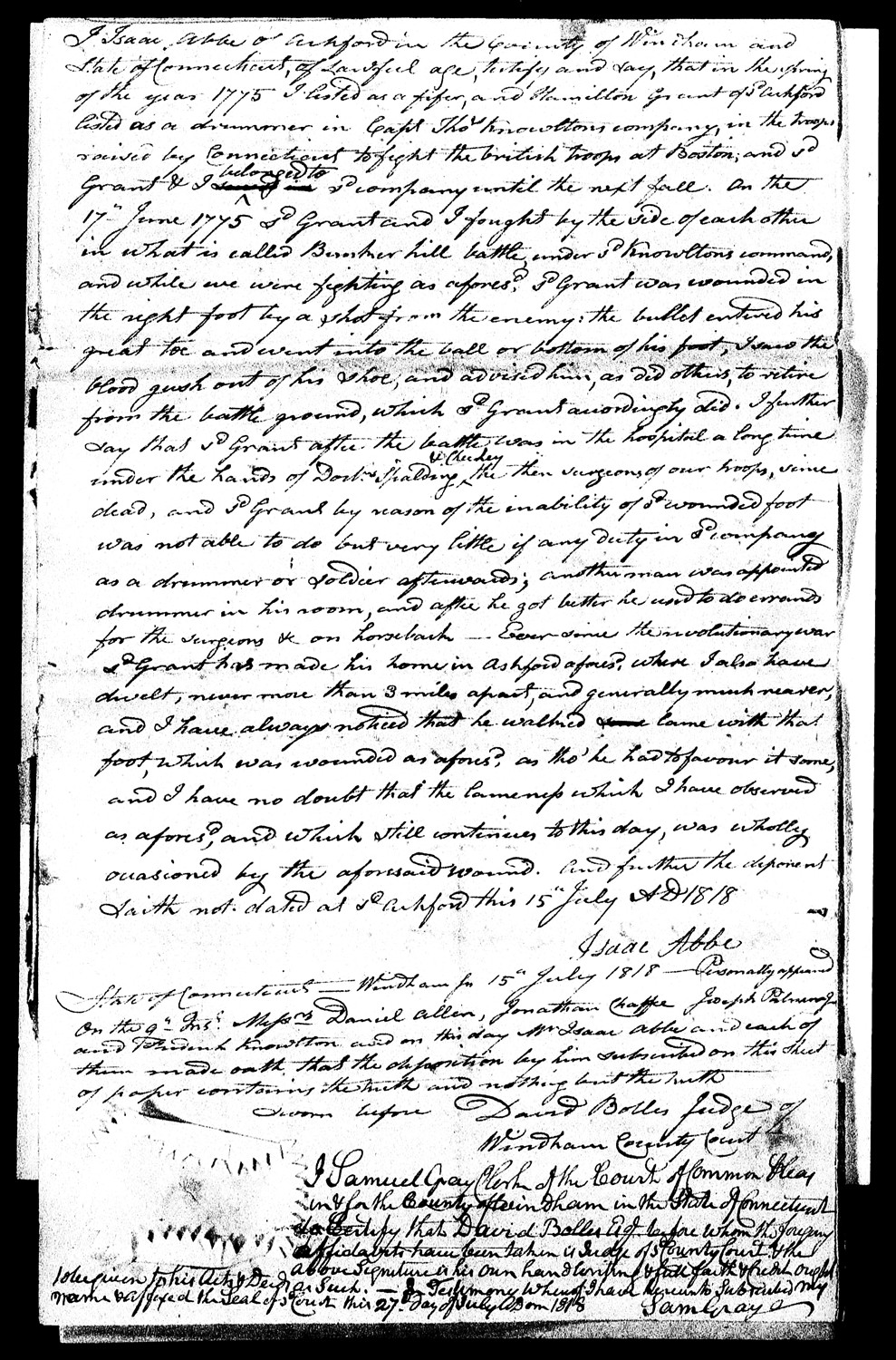 I, Isaac Abbe of Ashford in the County of Windham and the State of Connecticut, of Lawful age, testify and say, that in the spring of the year 1775 I listed as a fifer, and Hamilton Grant of S Ashford listed as a drummer in Capt Thos Knowltons company, in the troops received by Connecticut to fight the british Troops at Boston, and sd Grant & I belonged to sd company until the next fall. On the 17th June 1775 sd Grant and I fought by the side of each other in what is called Bunker hill battle, under sd Knowltons command, and while we were fighting as aforesd, sd Grant was wounded in the right foot by a shot from the enemy; the bullet entered his great toe and went into the ball or bottom of his foot, I saw the blood gush out of his shoe, and advised him, as did others, to retire from the battle ground, which sd Grant accordingly did. I further say that sd Grant after the battle was in the hospital a long time under the hands of Dortins Spalding & checking the then surgeons of our troops, since dead, and sd Grant by reason of the inability of sd wounded foot was not able to do but very little if any duty in sd company as a drummer of soldier afterwards; another man was appointed drummer in his room, and after he got better he used to do errands for the surgeons & on horseback - Ever since the revolutionary war sd Grant has made his home in Ashford aforesd, where I also have dwelt, never more than 3 miles apart, and generally much nearer, and I have always noticed that he walked lame with that foot, which was wounded as aforesd, as tho' he had to favour it some, and I have no doubt that the lameness which I have observed as aforesd, and which still continues to this day, was wholly occasioned by the aforesd wound. And further the deponent saith not. dated at So Ashford this 15th July AD 1818
