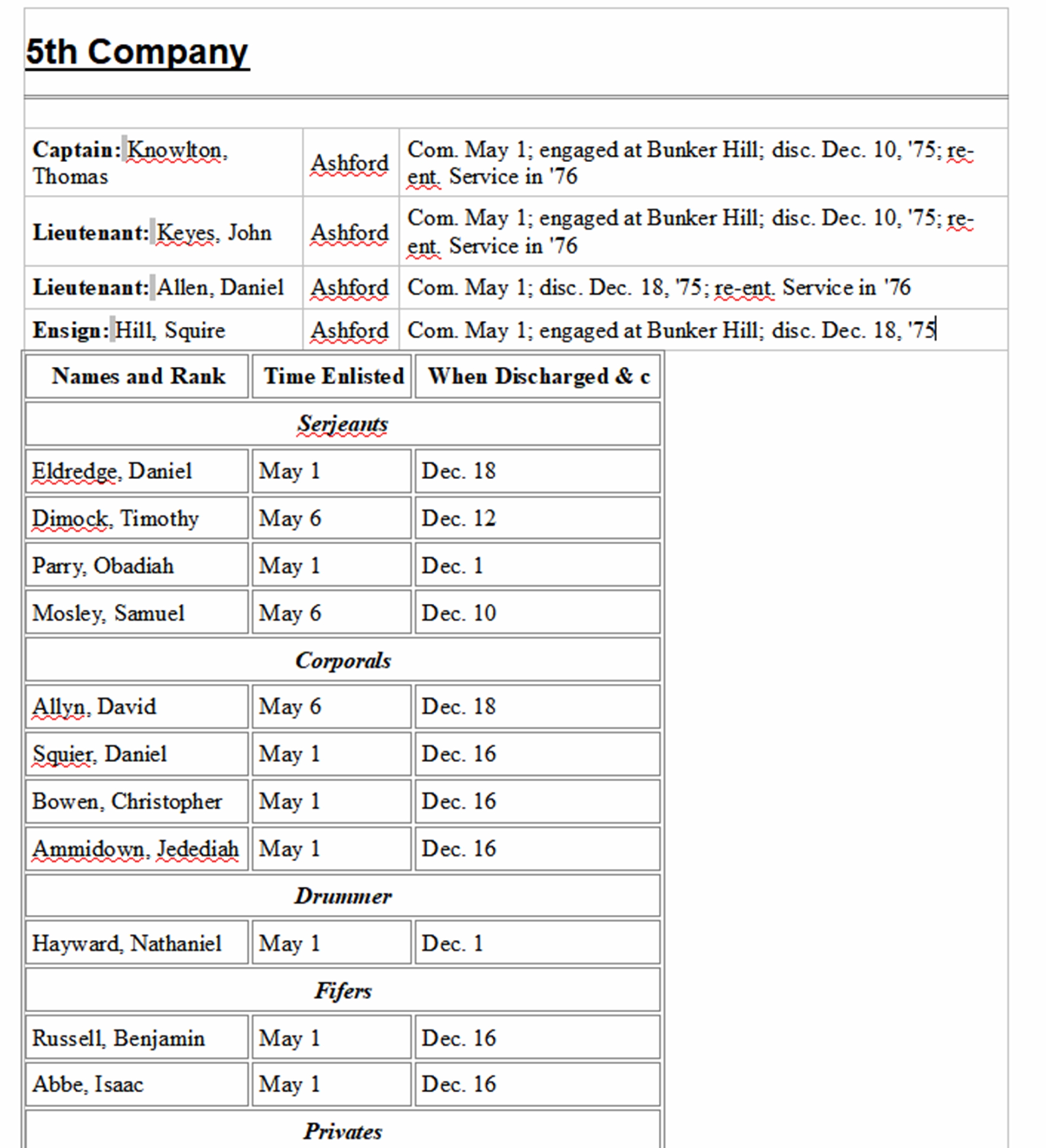 Third Regiment (General Putnam), 5th Company (Captain Knowlton): Isaac Abbey (listed as a Fifer) Enlisted May 1, 1775, and Discharged December 16, 1775. He participated in the Battle of Bunker Hill.
