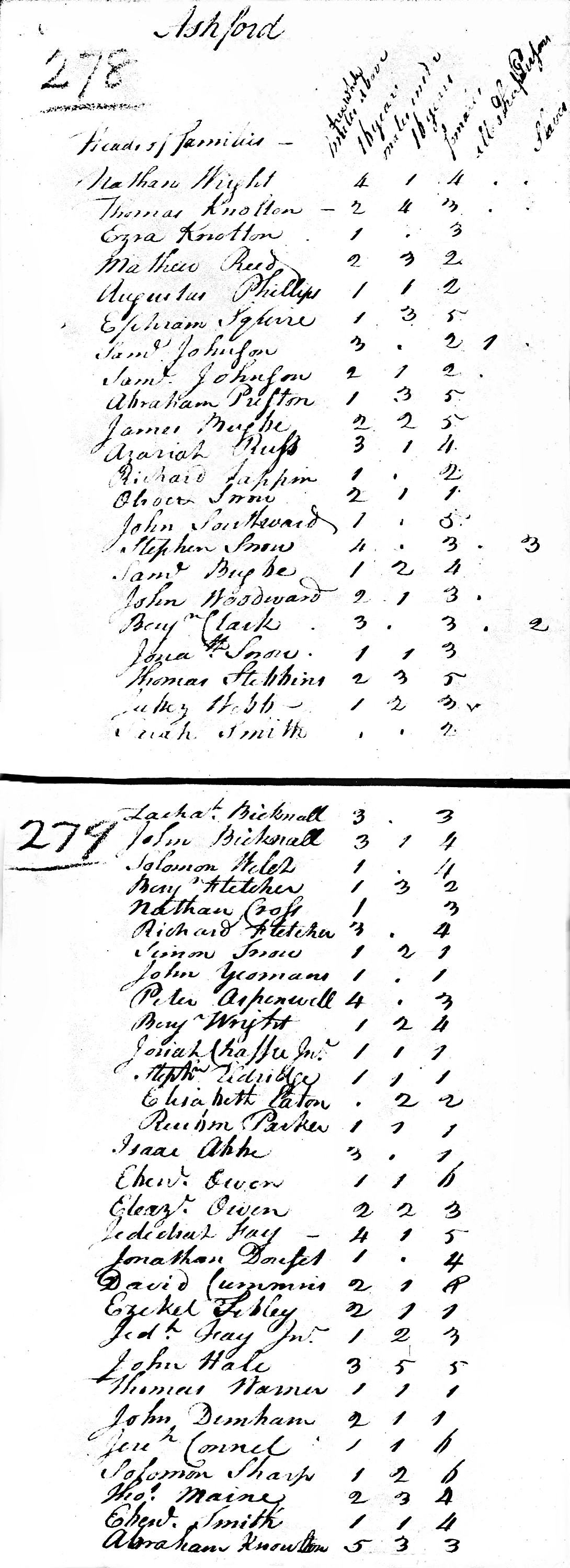 The 1790 U. S. Census taken in 1790 shows Isaac Abbe is the Head of Household, and is living in Ashford Twp., Windham Co., CT. Living there are: a total of 3 White Males above 10 years of age, no Males under 10 years of age, and 1 Female. Other Knowlton families live nearby.
