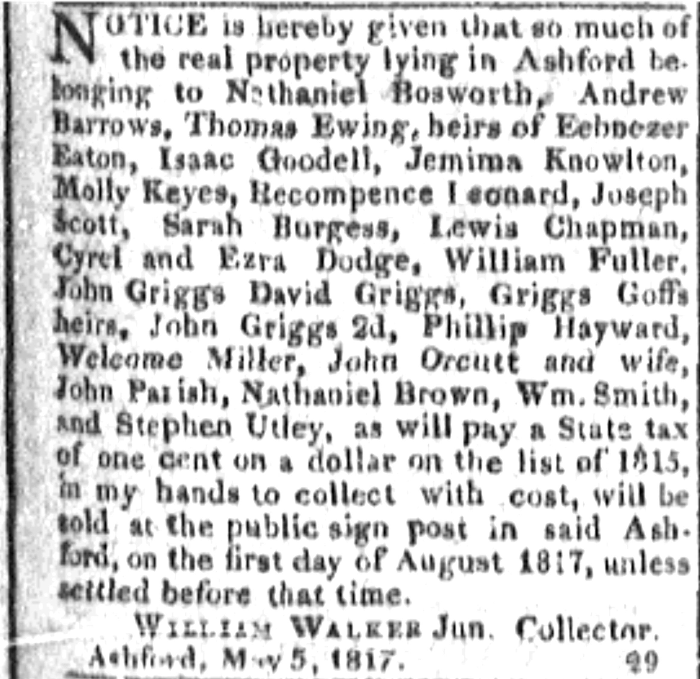 In 1817, land owned by numerous Bosworth families were scheduled to be sold due to non-payment of taxes