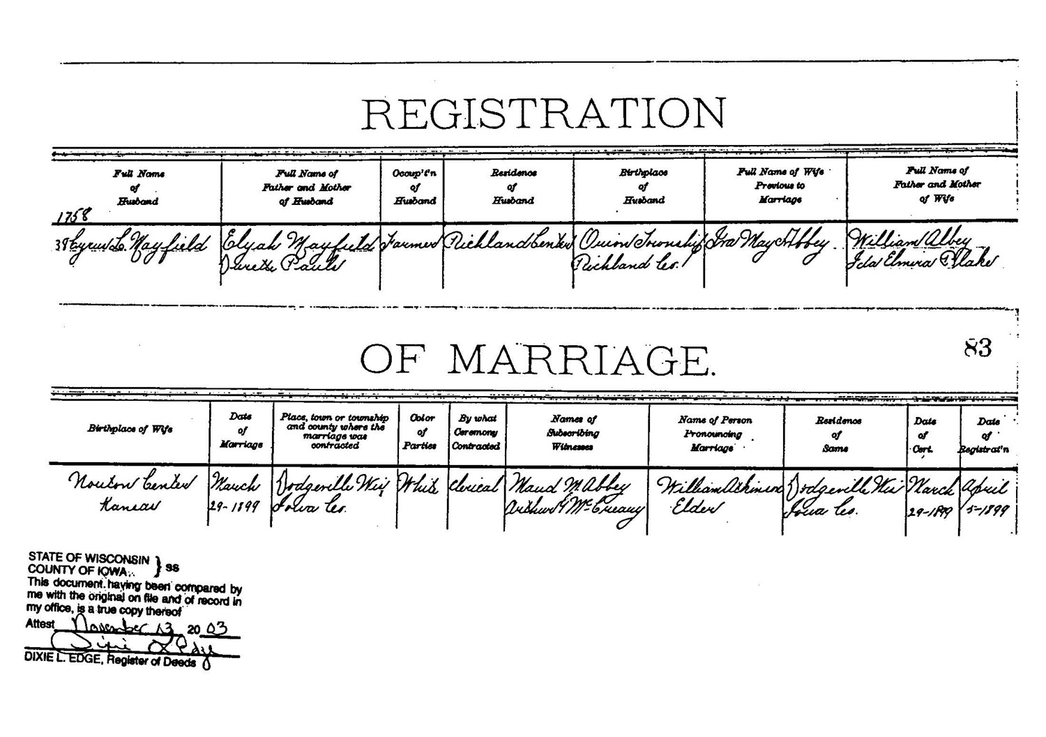 Married, at the home of the bride's parents, Mr. and Mrs. Wm. Abbey, in the city of Dodgeville, March 29, 1899, by Rev. Wm. Atkinson, Mr. Cyrus L. Mayfield, of Richland Center, and Miss Iva May Abbey.