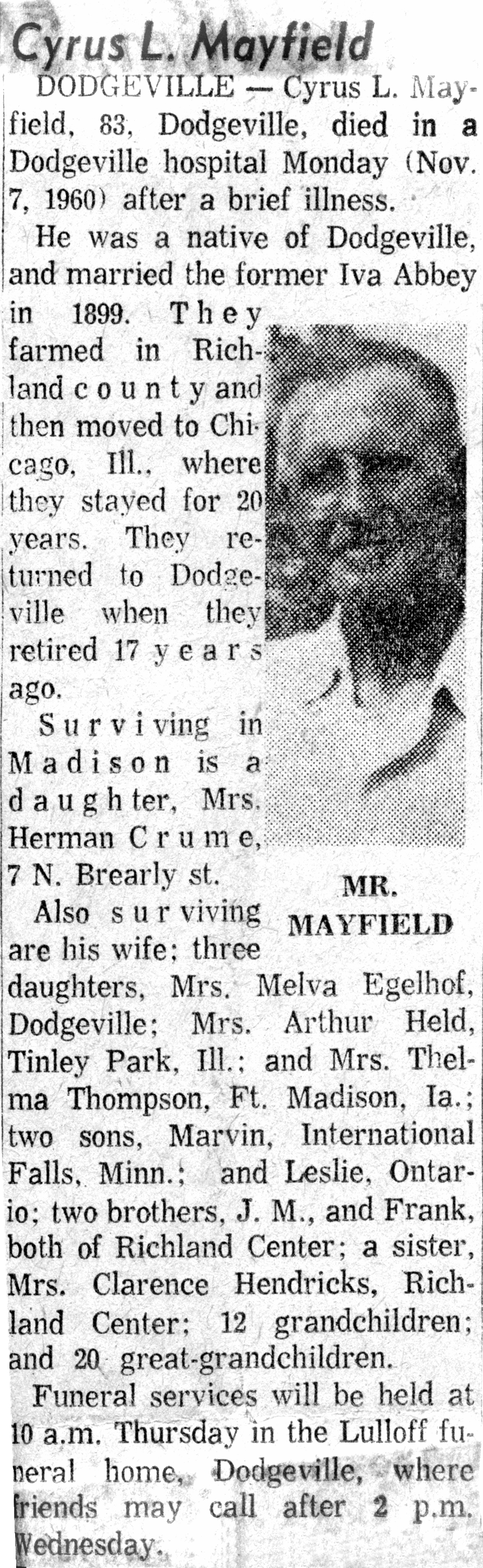 DODGEVILLE - Cyrus L. Mayfield, 83, Dodgeville, died here Monday. He was a native of Dodgeville, and married the former Iva Abbey in 1899. They farmed in Richland county and then moved to Chicago, Ill., where they stayed for 20 years. They returned to Dodgeville when they retired 17 years ago. Surviving in Madison is a daughter, Mrs. Herman Crume, 7 Brearly st. Also surviving are his wife; three daughters, Mrs. Melva Egelhof, Dodgeville; Mrs. Arthur Held, Tinley Park, Ill; and Mrs. Thelma Thompson, Ft. Madison, Ia.; two sons, Marvin, International Falls, Minn.; and Leslie, Ontario; two brothers, J. M., and Frank, both of Richland Center; a sister, Mrs. Clarence Hendricks, Richland Center; 12 grandchildren; and 26 great-grandchildren. Funeral services will be held at 10 a. m. Thursday in the Lulloff funeral home, Dodgeville, where friends may call after 2 p. m. Wednesday.