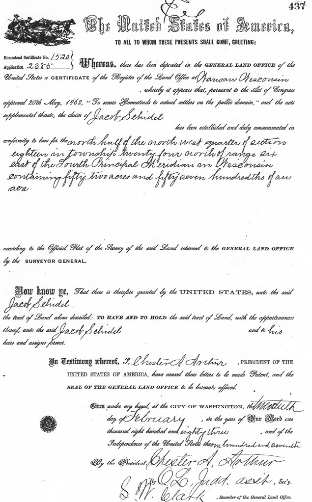 The 1895 Wisconsin State Census taken on June 20, 1895, shows Jacob Schidel is the Head of Household living in Carson Twp., Portage Co., WI. There are two males and one female in the family, of which 1 was born in the United States and 2 were born in Germany.