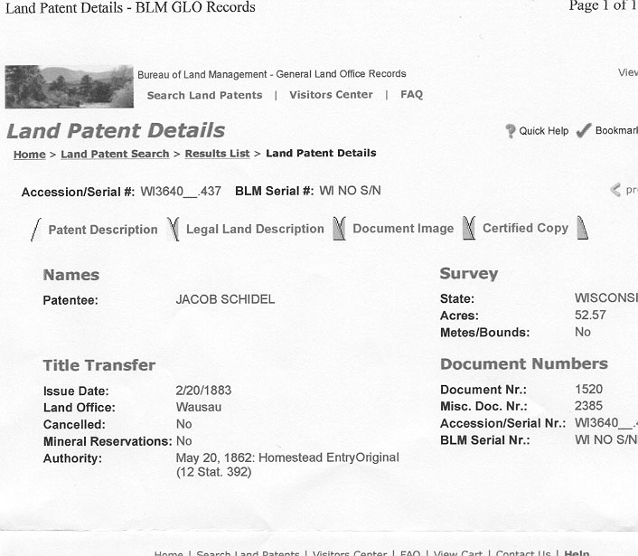 The 1905 Wisconsin State Census taken on June 1, 1905, shows Jacob Shidel (age 70) born in Germany to German-born parents owns his own home free of a mortgage and is living in the City of Stevens Point, Portage Co., WI. Living with him is his wife, Lucy Shidel (age 65) born in Germany to German-born parents.