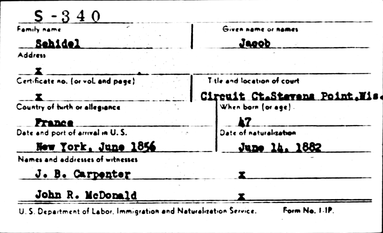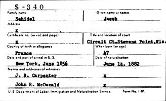 Jacob Schidel (age 47) became a Naturalized US Citizen on June 14, 1882, at the Circuit Court, Stevens Point, Portage Co., WI.