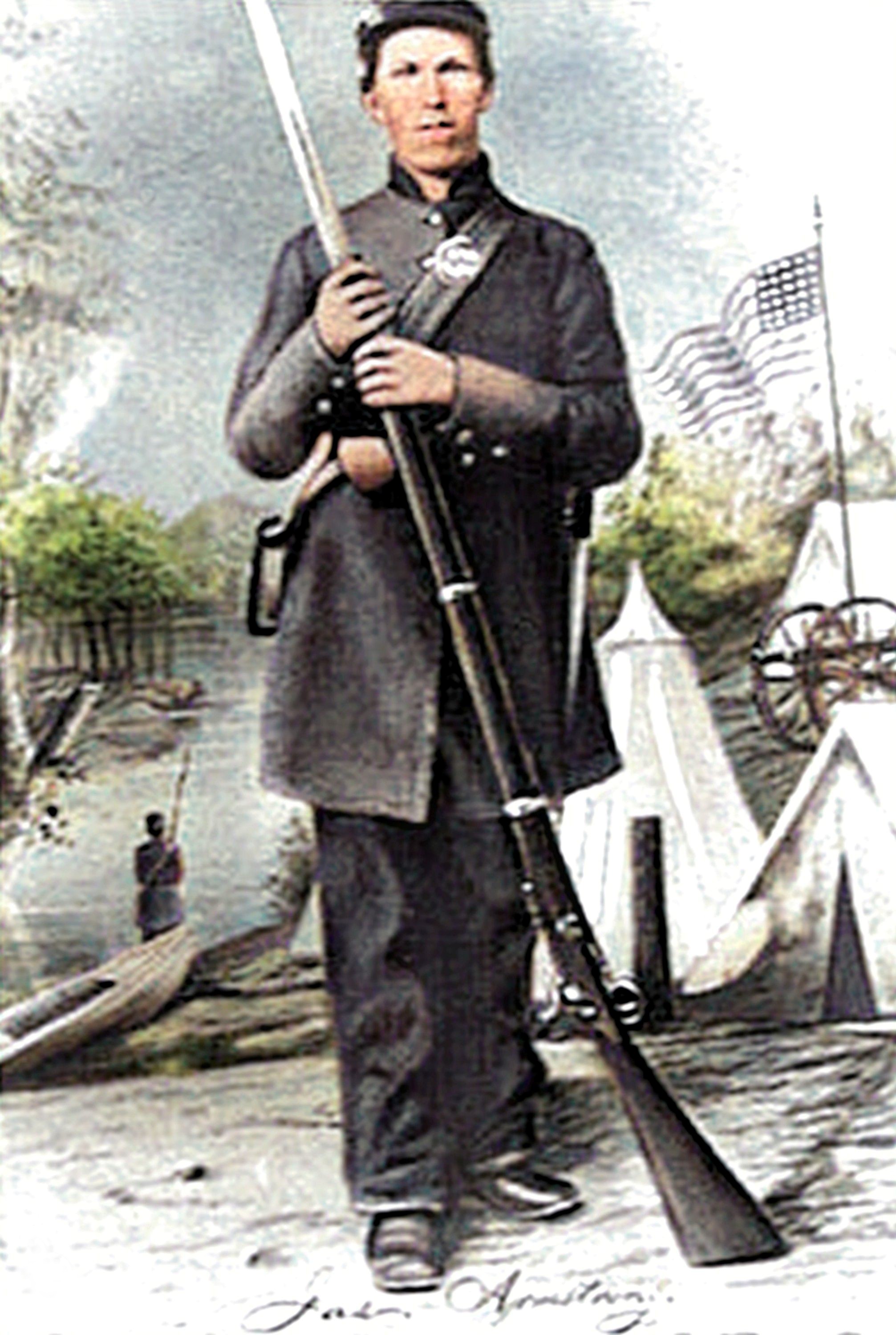 James Delos Armstrong in his Civil War uniform. Black and white picture courtesy of Jean Louise (Spencer) Sweeney (deceased). James Delos Armstrong enlisted at age 22 on January 13, 1864, at Eaton, NY; mustered in as a private in Company A, on January 13, 1864, for a term of three years; mustered out with company on September 29, 1865, at Washington, DC.