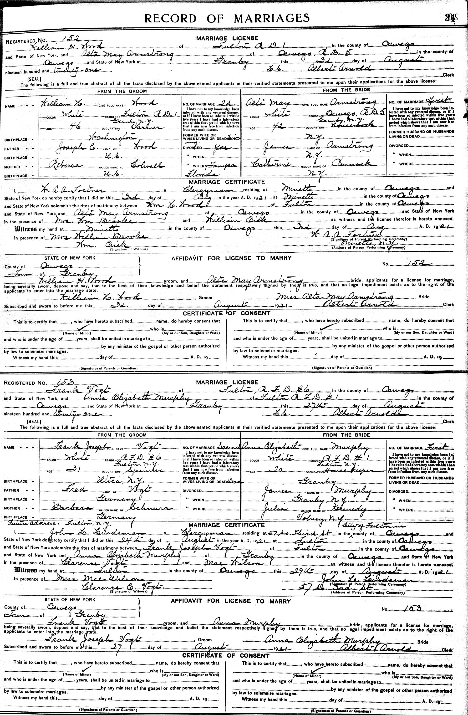 William Henry Wood and Alta May Armstrong were married August 3, 1921, in Minetto, Oswego Co., NY.