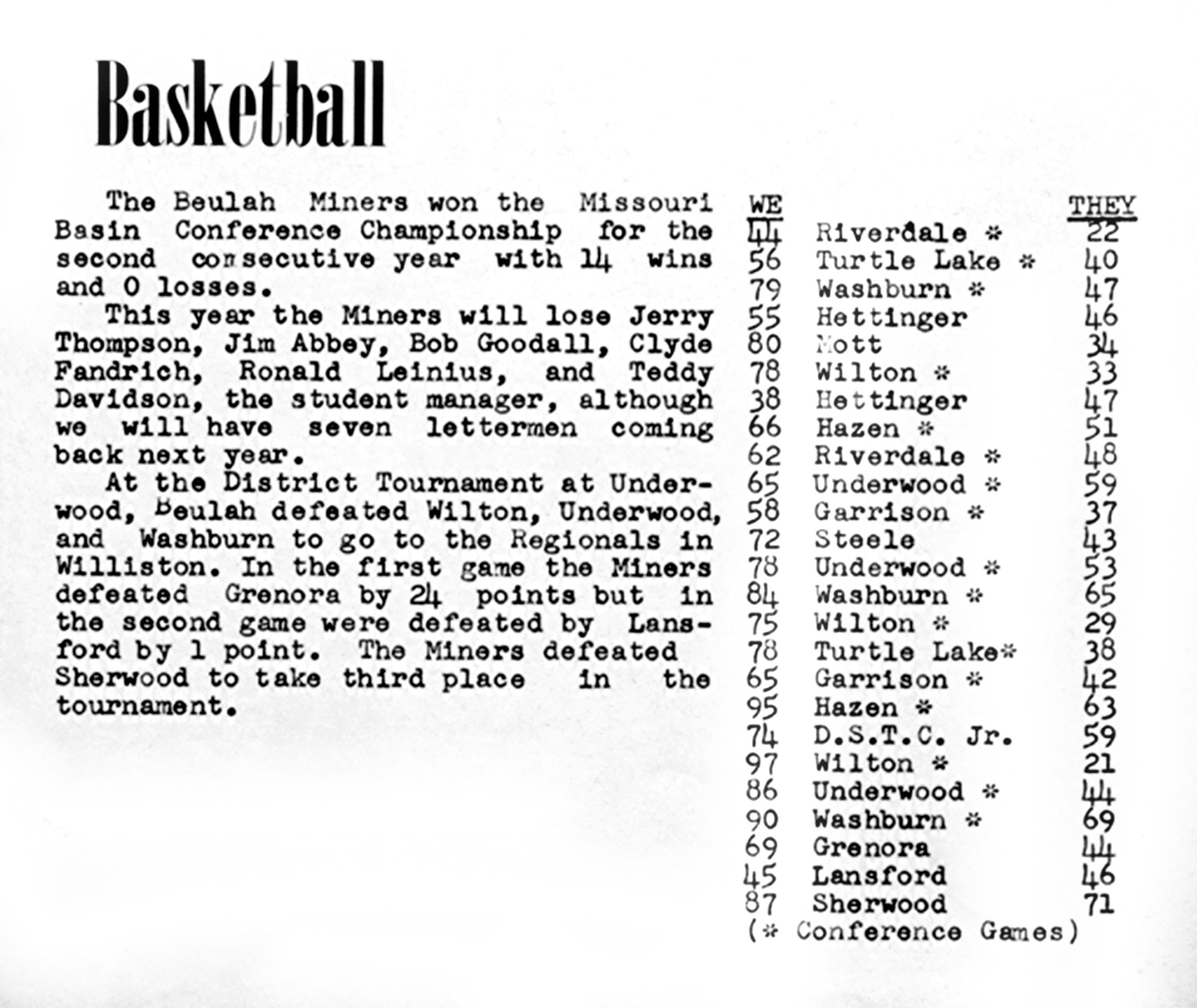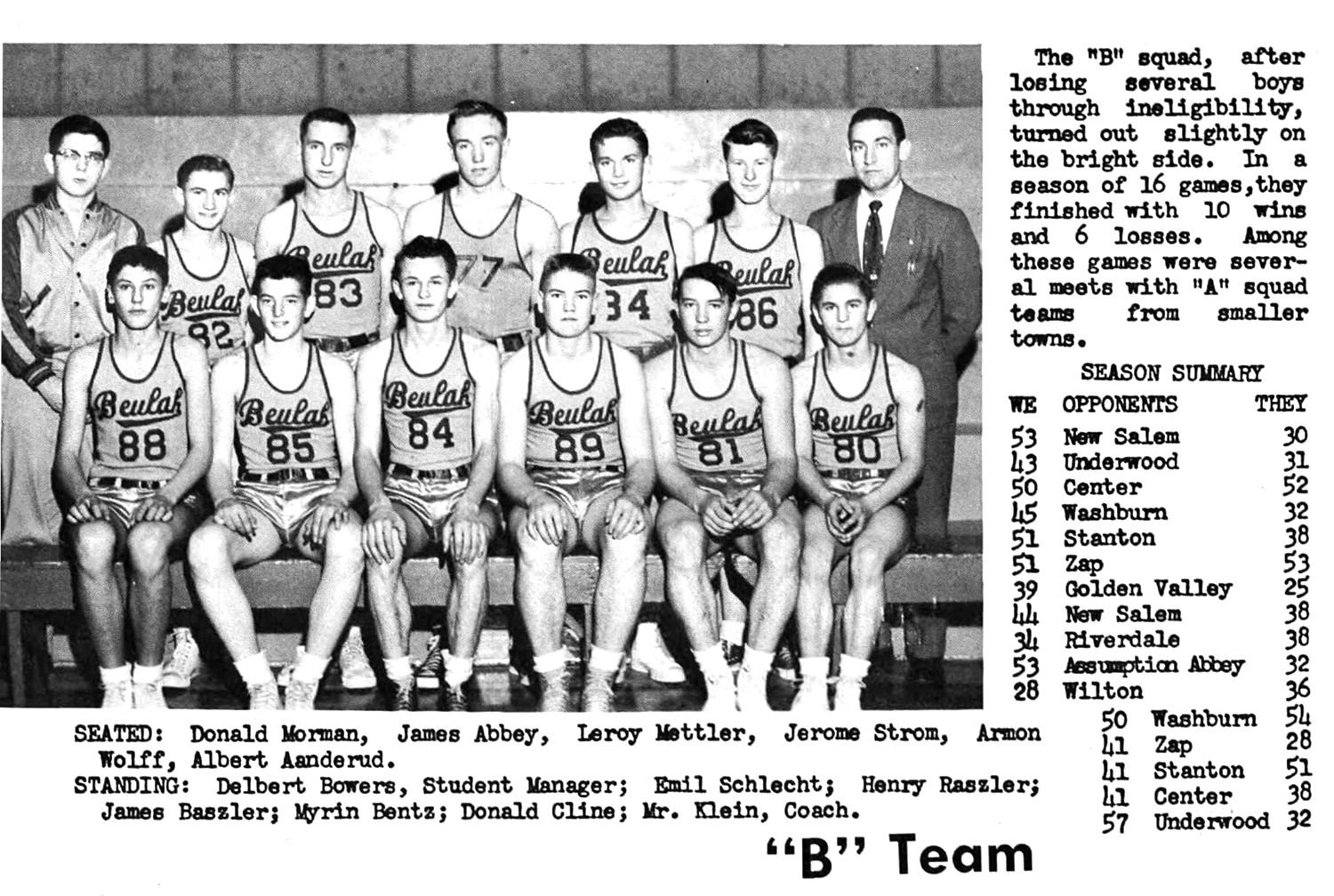 James Gerald "Jim" Abbey was also shown as participating in the sports programs in 1955, as shown in "The Miner" yearbook , Beulah High School, Beulah, Mercer Co., ND, 1955. While James Gerald "Jim" Abbey was in the 1955 graduating class of Beulah High School, he liked school so much he returned to continue his education another year.