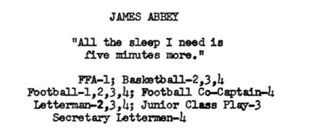 James Gerald "Jim" Abbey was in the 1955 graduating class of "The Miner" yearbook , Beulah High School, Beulah, Mercer Co., ND . James Gerald "Jim" Abbey liked school so much that he returned to continue his education another year.