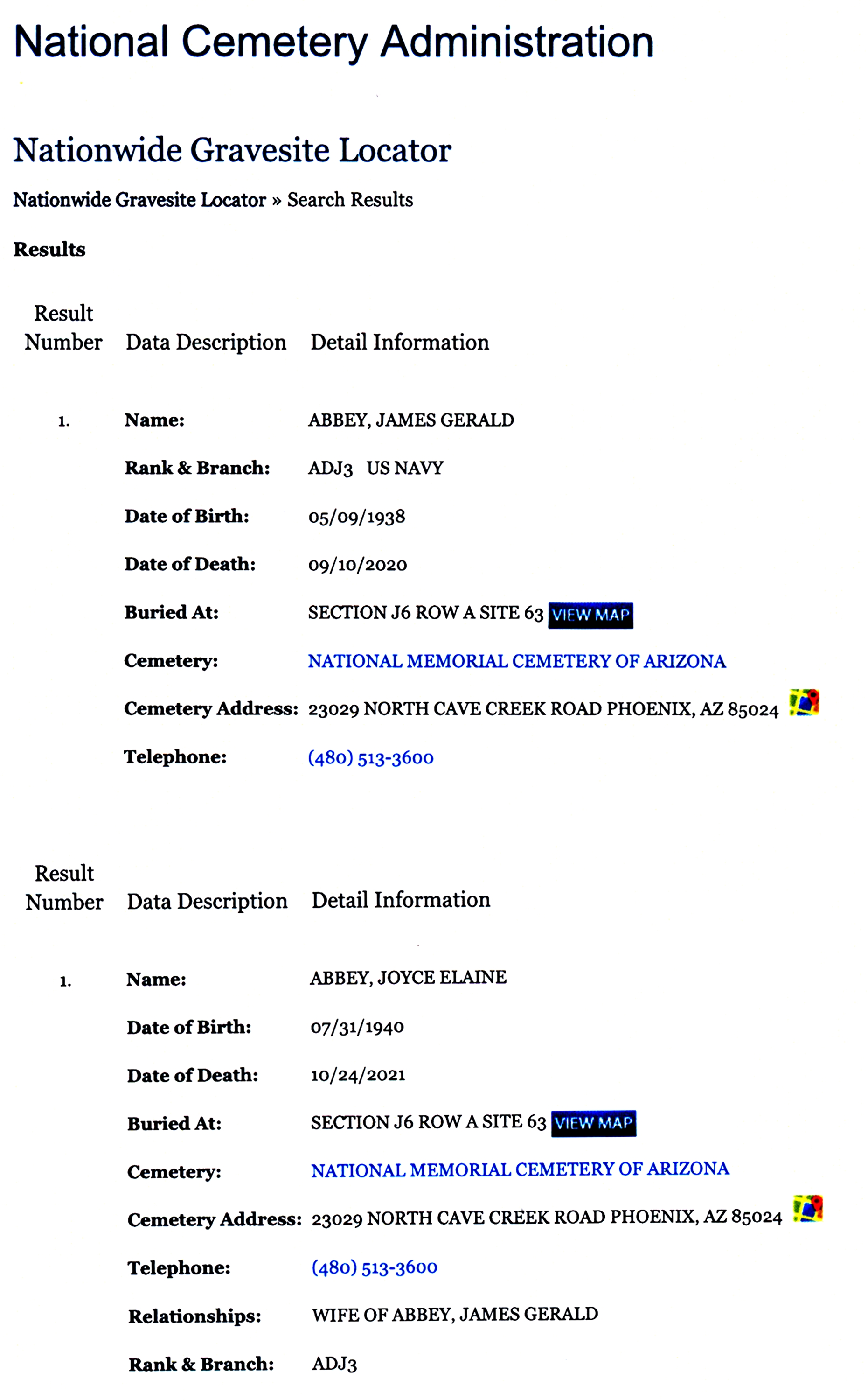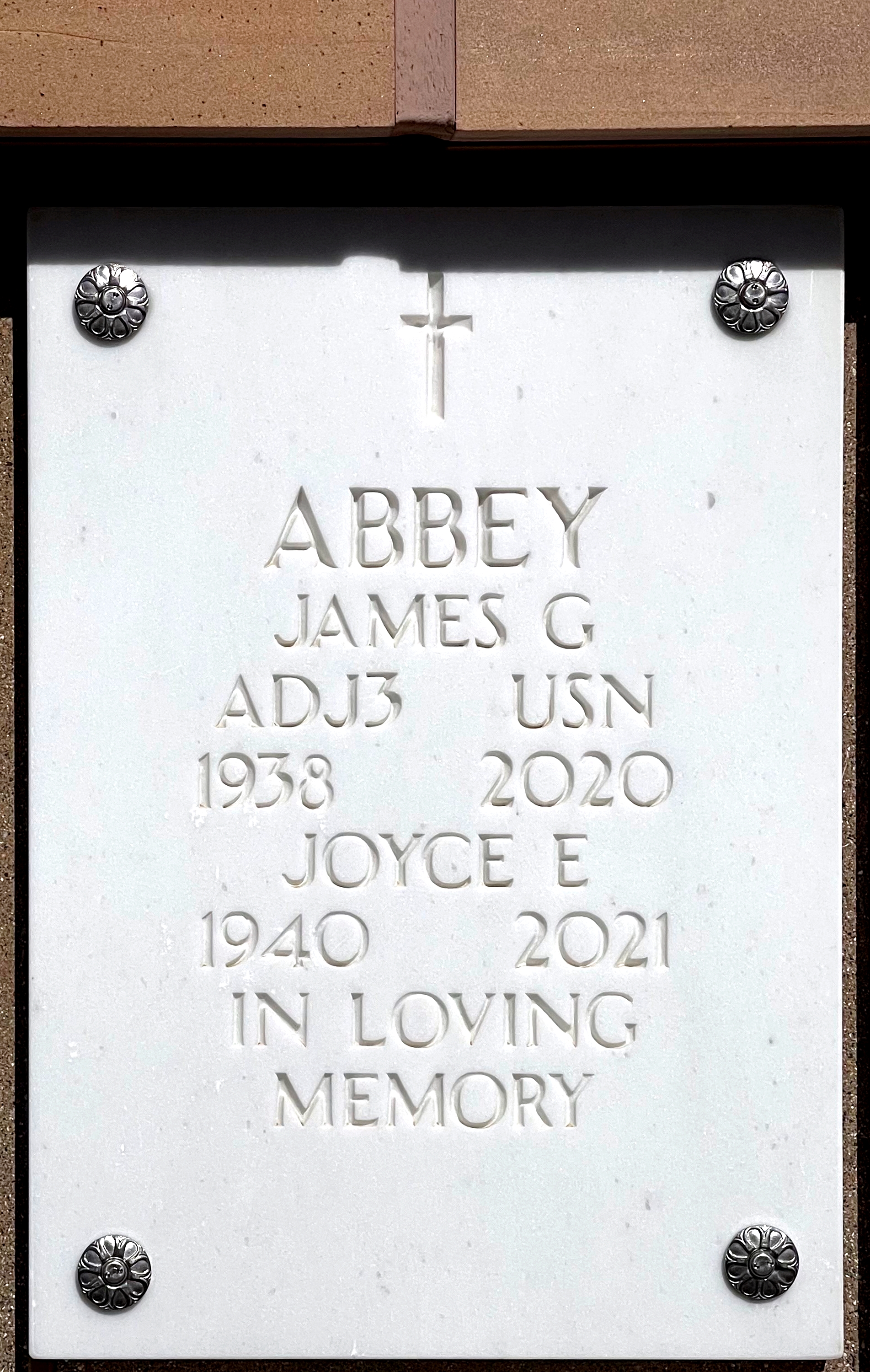 James Gerald "Jim" Abbey and Joyce Elaine (Erdmann) Abbey are interred in the National Memorial Cemetery of Arizona, Phoenix, Maricopa Co., AZ.