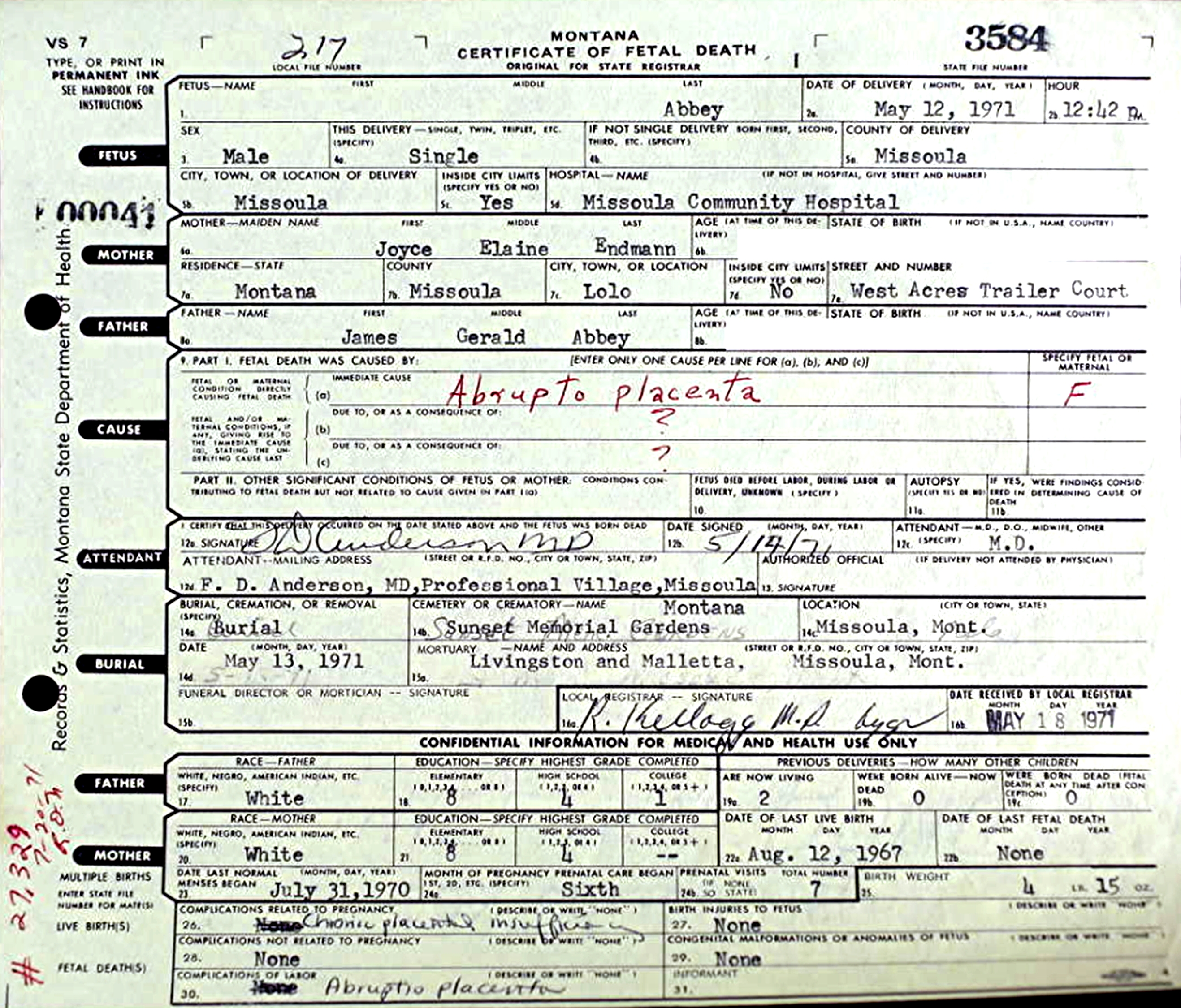 - Unnamed Male Abbey : Born May 12, 1971, at Missoula Community Hospital, Missoula, Missoula Co., MT. Died May 12, 1971, at Missoula Community Hospital, Missoula, Missoula Co., MT (age Stillborn Infant). Buried in Sunset Memorial Gardens, Missoula, Missoula Co., MT.