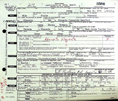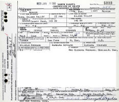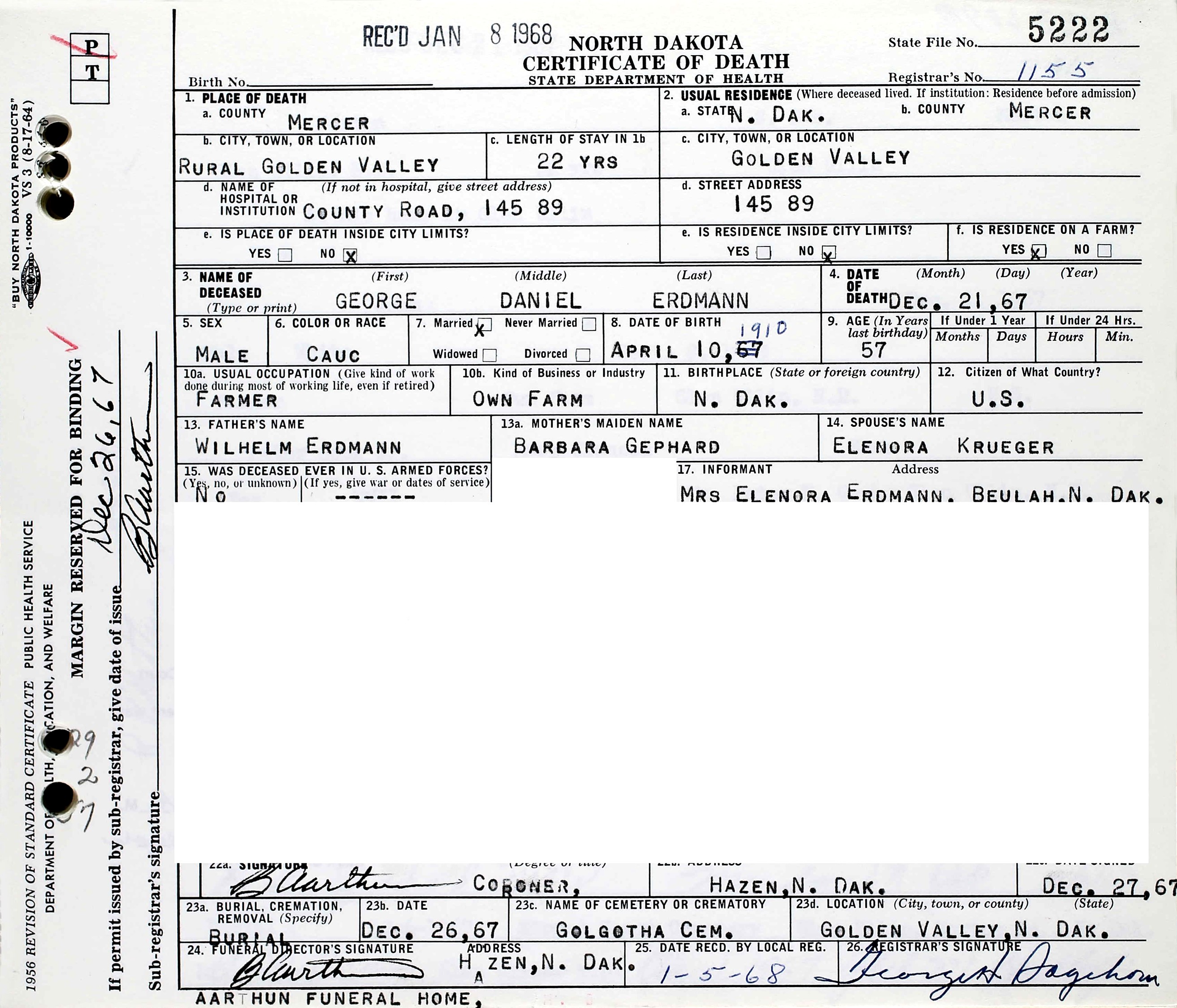 George Daniel Erdmann died December 21, 1967, on County Road, Township 145N, Range 89W, Mercer Co., ND, from exposure to the cold weather, while walking to his home about one mile away in rural Golden Valley, Mercer Co., ND, at age 57. Buried in Golgotha Cemetery, Golden Valley, Mercer Co., ND.