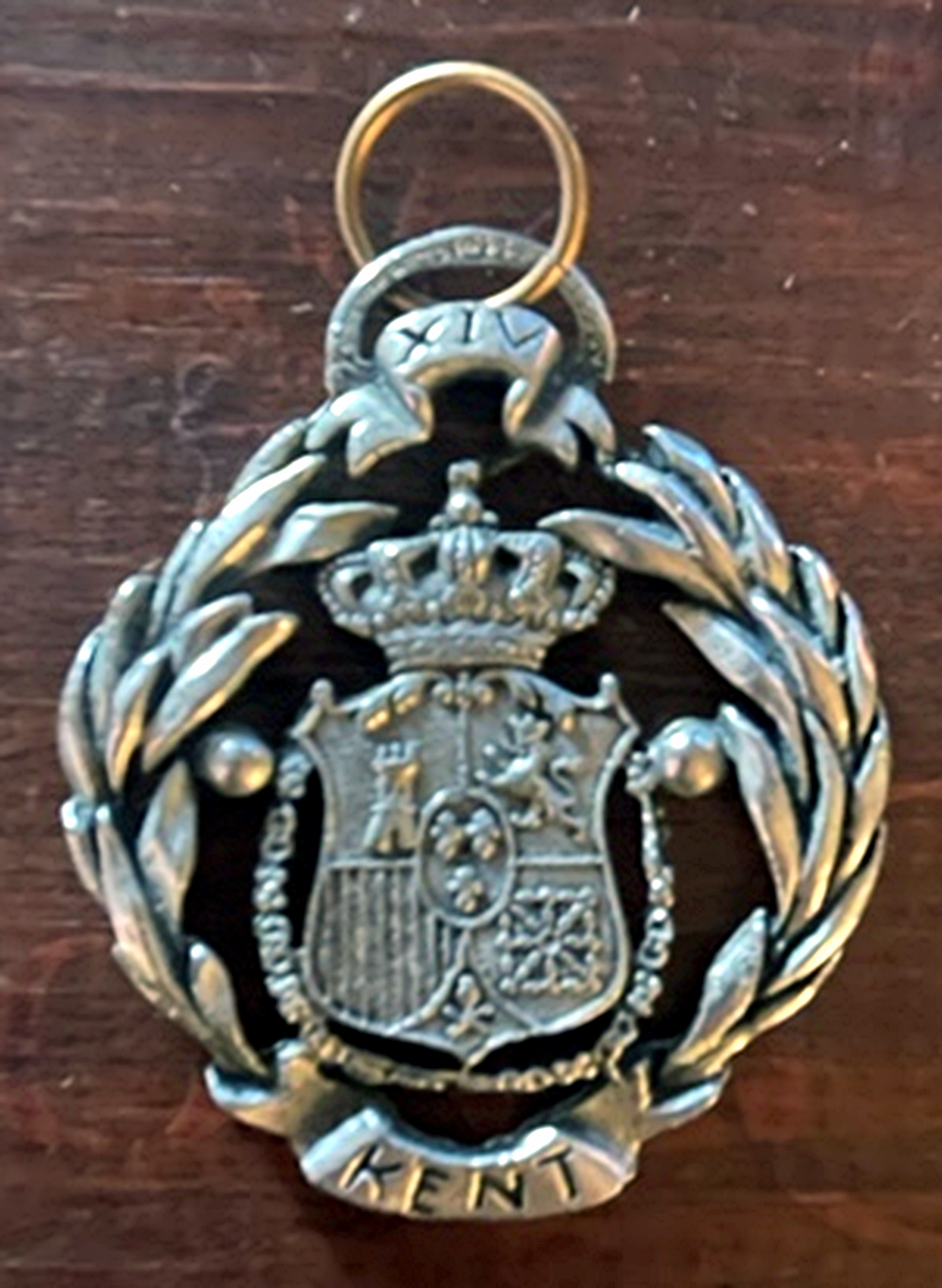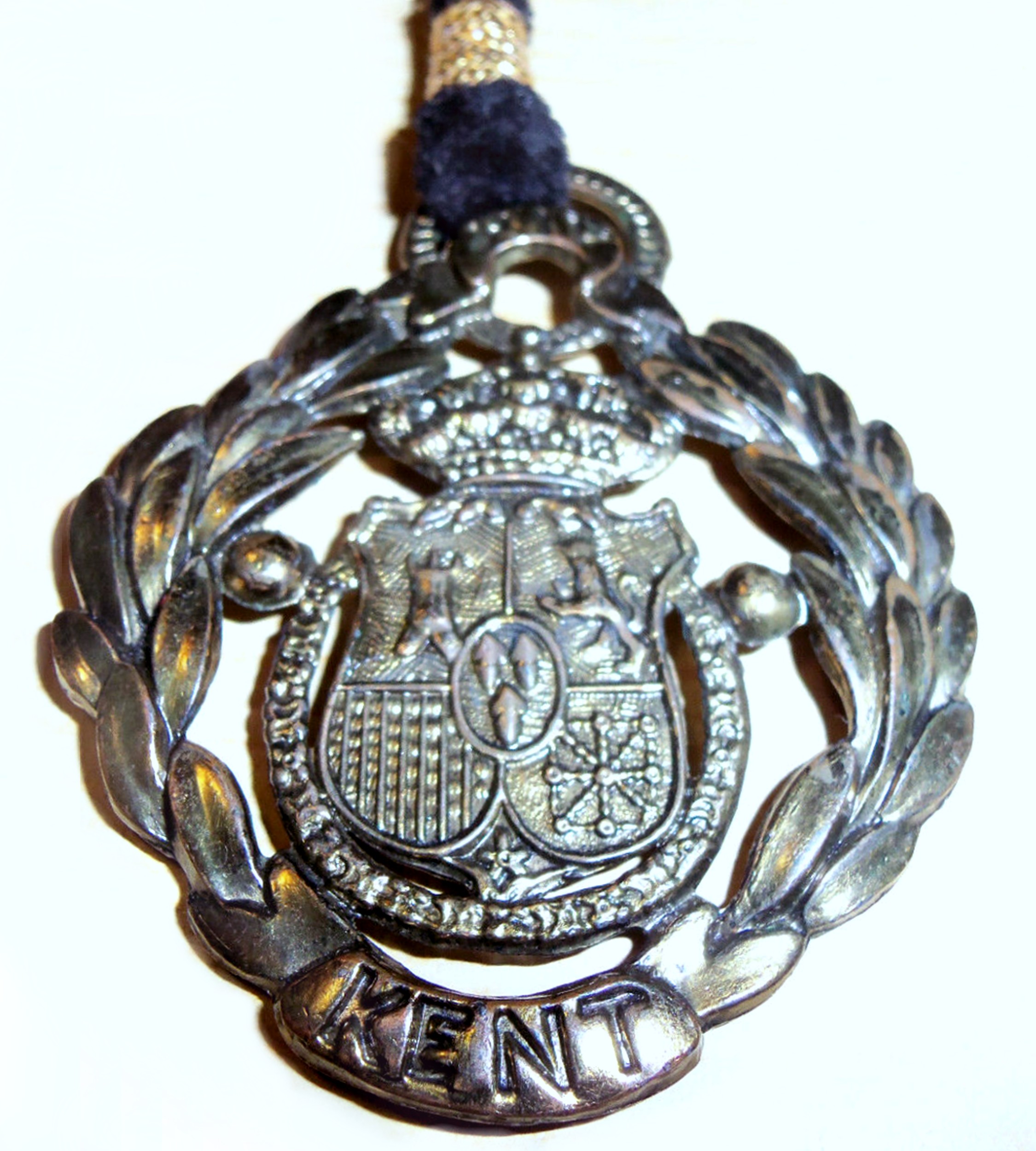 Kent Crest Medallion . Photo on the left courtesy of Julie Lyn (Abbey) Hakalmazian , who found the badge among the effects of her father, J ames Gerald "Jim" Abbey. This is likely a souvenir that Jim obtained, since he did not serve with the British in WWII. The photo on the right was found on e-Bay, with description that it was made in Japan.