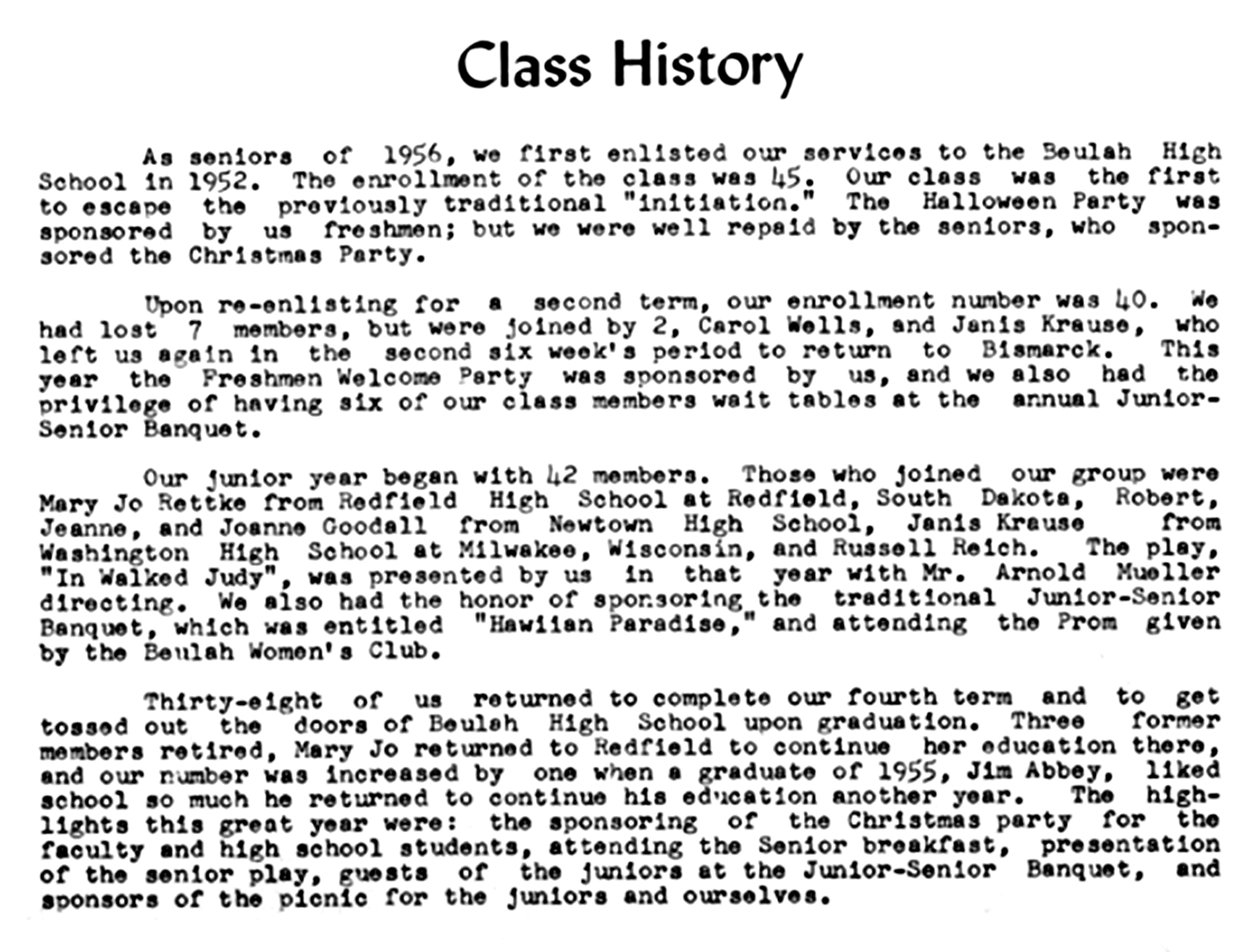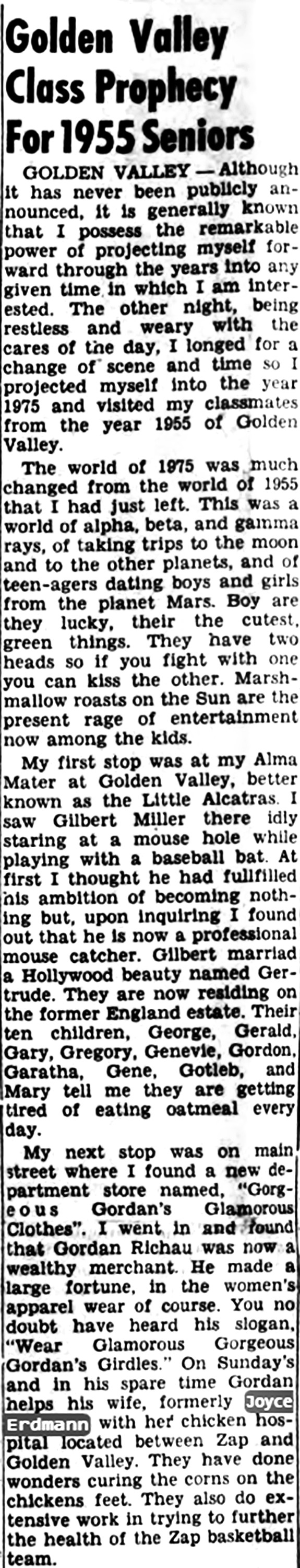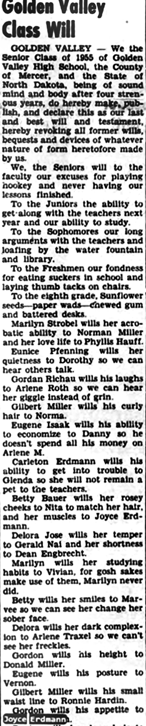 Two articles from the Beulah Independent in 1955 which infer that Gordon J. Richau and Joyce Erdmann are "an item." The tongue-in-cheek Class Prophesy projects 20 years into the future. The Class Will makes humorous comments about Gordon, and also about Joyce.