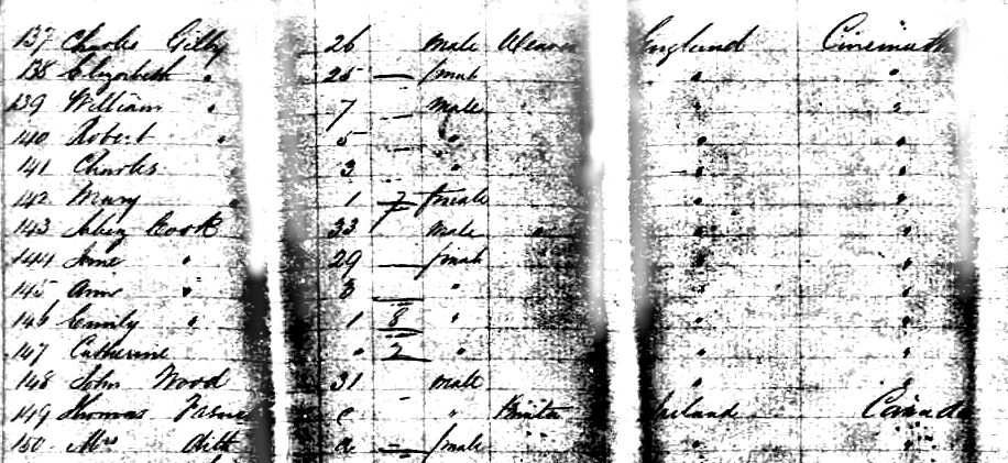 The 1853 Immigration Passenger Lists for the Gilby families. Port of departure: Liverpool, England. Ship Name: William Tapscott. Port of arrival: November 9, 1853, in New York. Family Origin: England. Family Destination: ? An Emily Straw seems to have been traveling with the Gilbys.