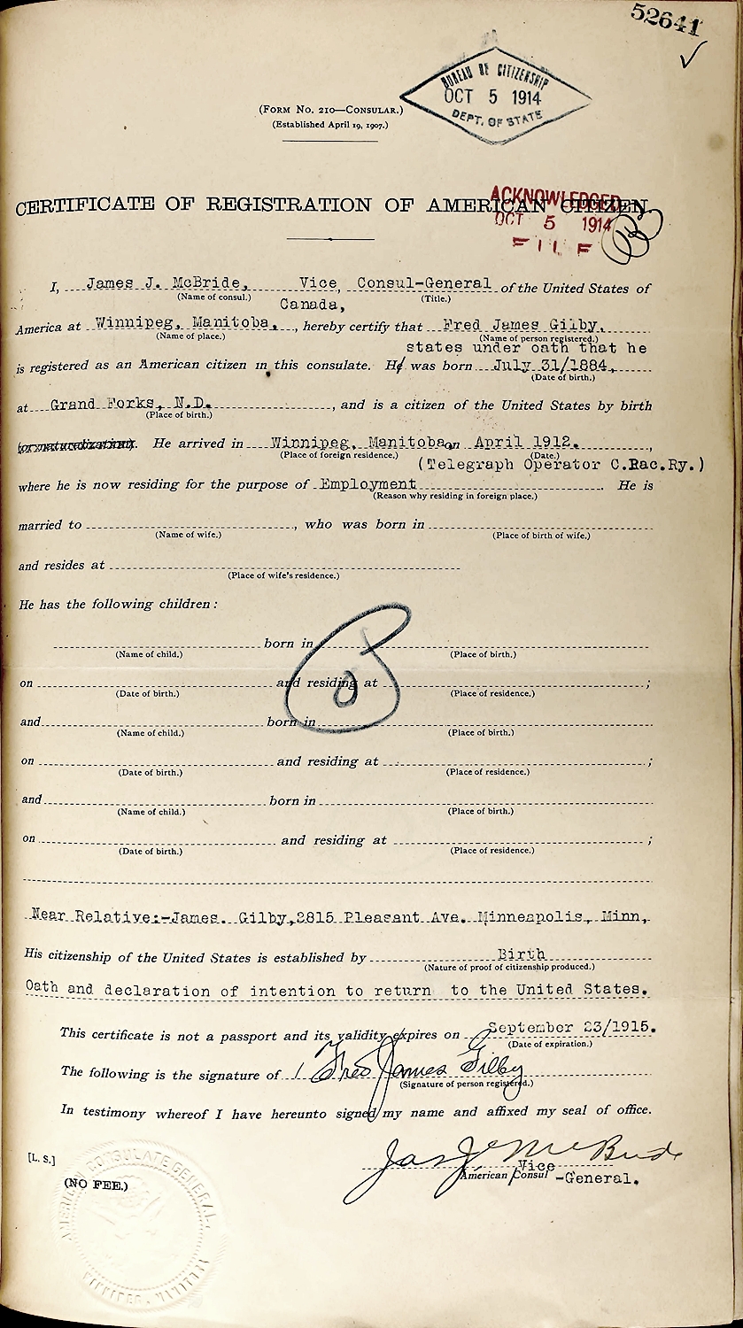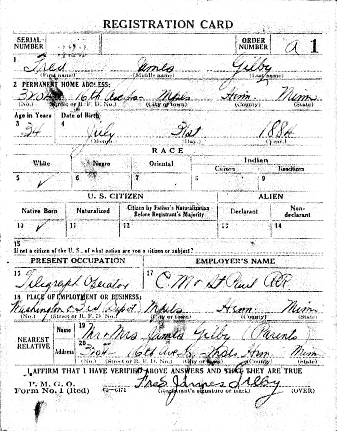 - Frederick James "Fred" Gilby : Born July 31, 1884, in North Dakota; Died October 9, 1946, in Minneapolis, Hennepin Co., MN (age 60). Buried in Lakewood Cemetery, Minneapolis, Hennepin Co., MN.