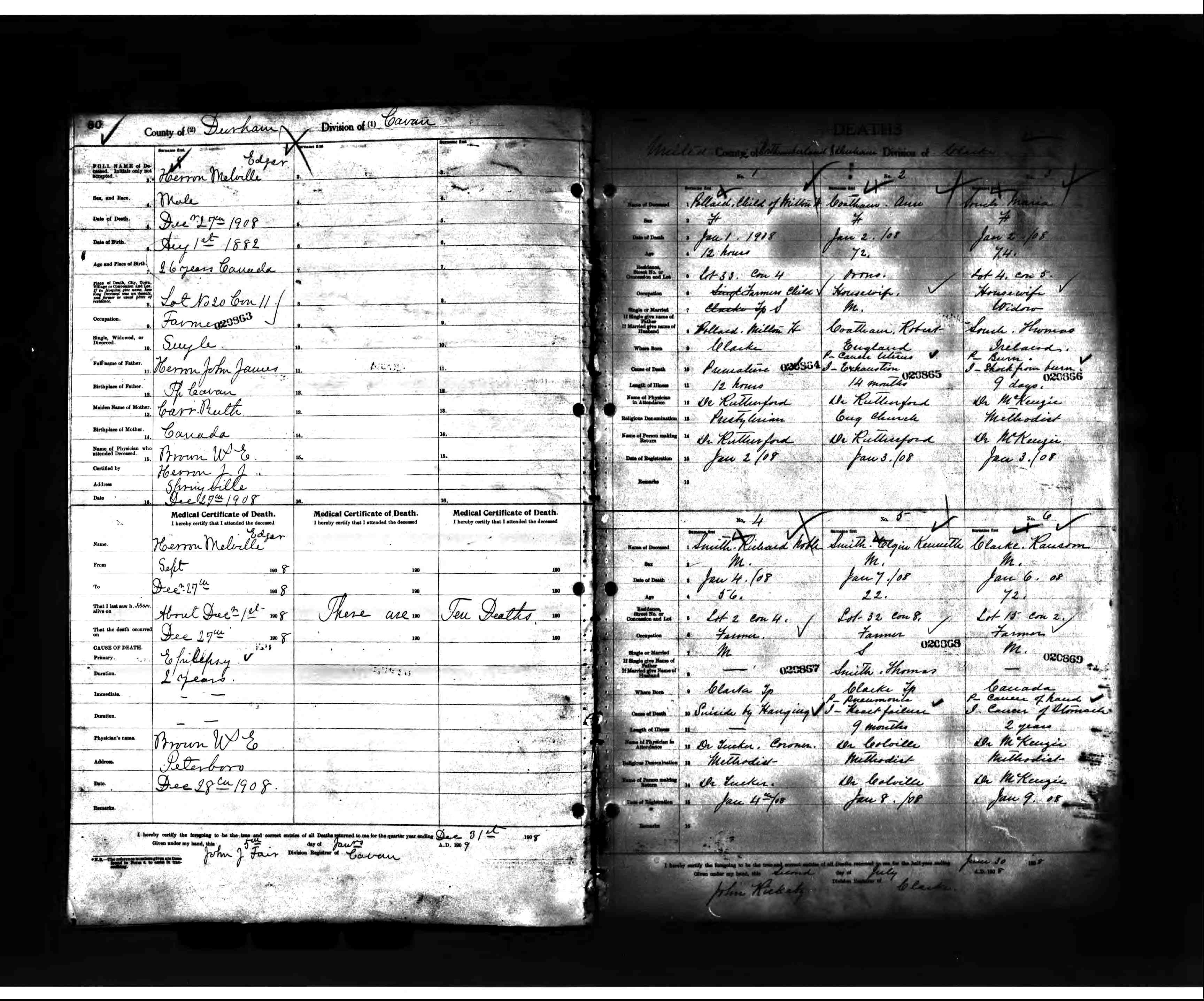 Ransom Clarke died January 6, 1908, in Lot 15, Concession 2, Northumberland and Durham Counties, Ontario, Canada.