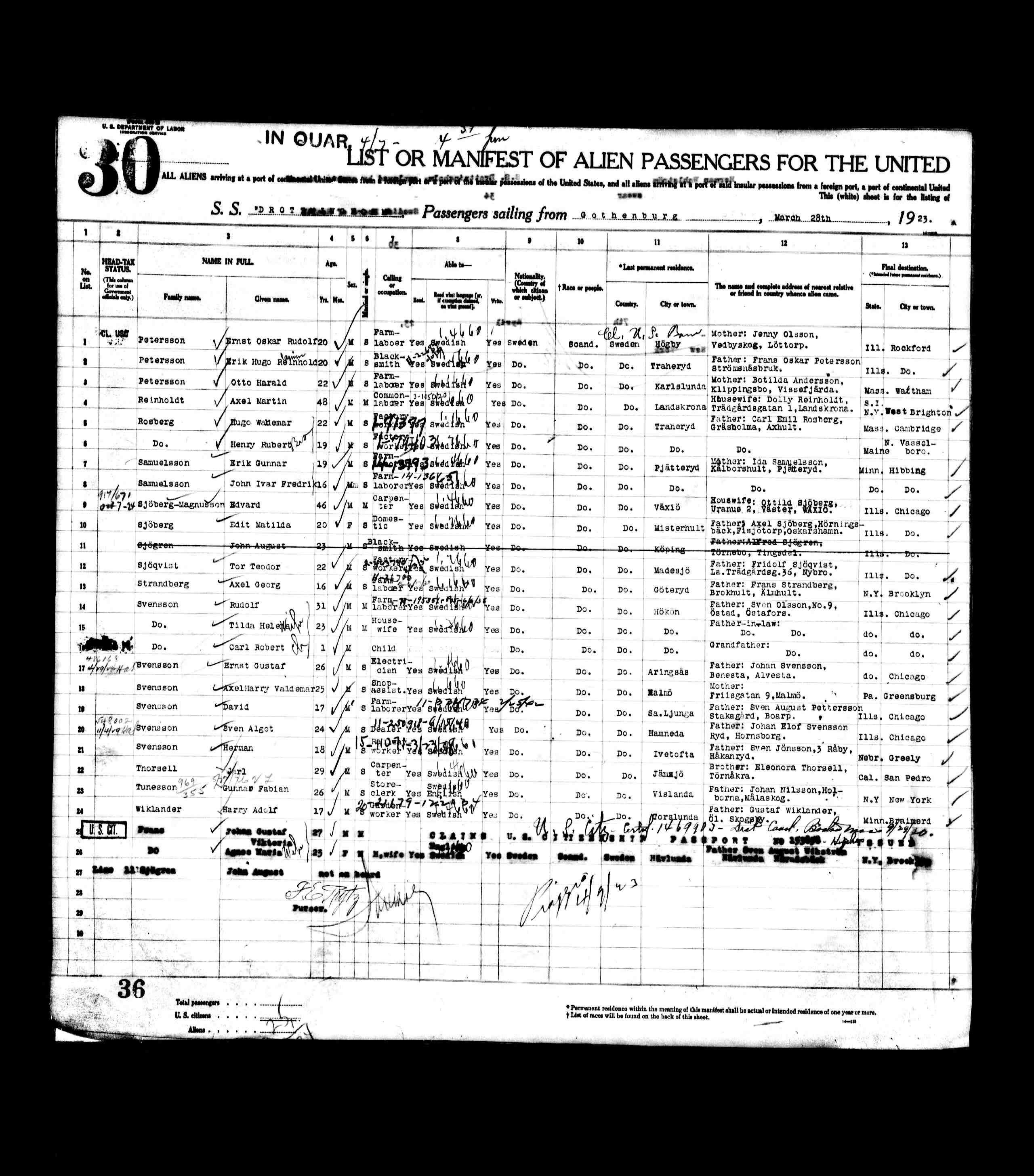 On April 7, 1923, Jarl Thorsell arrived in the Port of New York aboard the S. S. Drottningholm. Departure port was Gothenburg. He is a 29 year old Carpenter and was living in J�mj�, Sweden. His closest relative was his brother (should be mother), Eleonora Thorsell, T�rn�kra. His destination is San Pedro, CA.