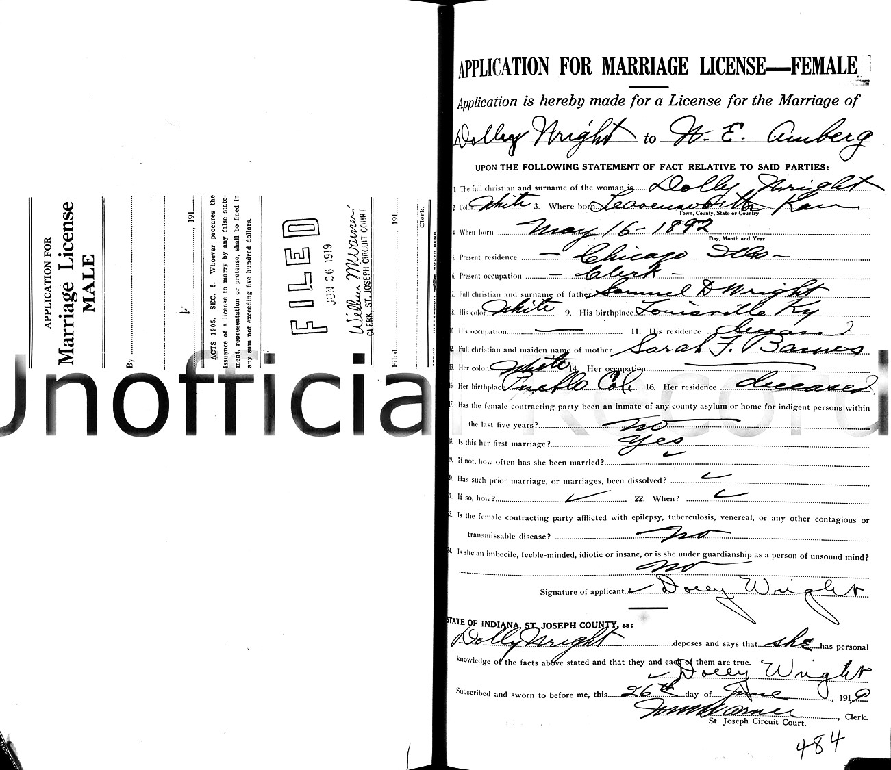 Walter Edward Amberg and Dolly A. Wright were married June 26, 1919, in Indiana.
