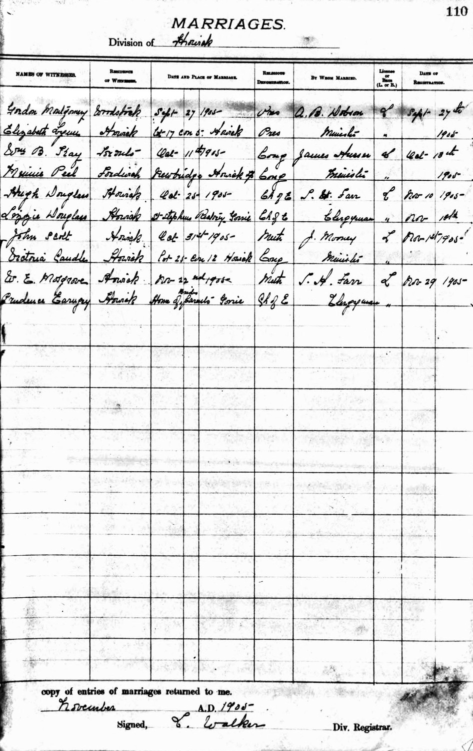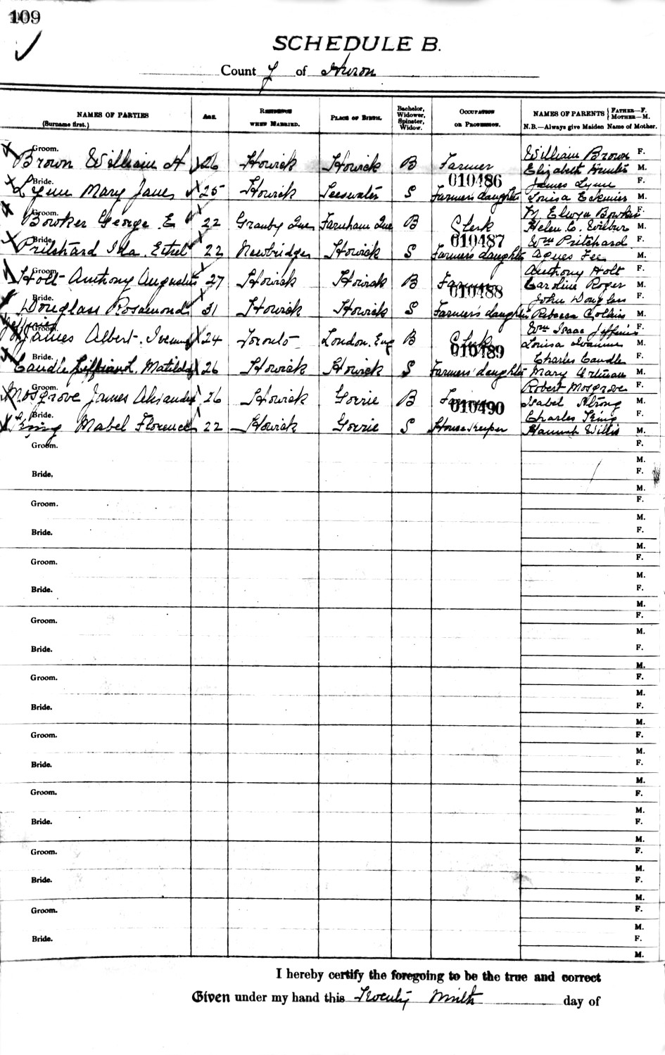 George Elwyn Bowker and Ida Ethel Pritchard were married October 11, 1905, in Newbridge, Horwick Twp., Huron Co., Ontario, Canada.