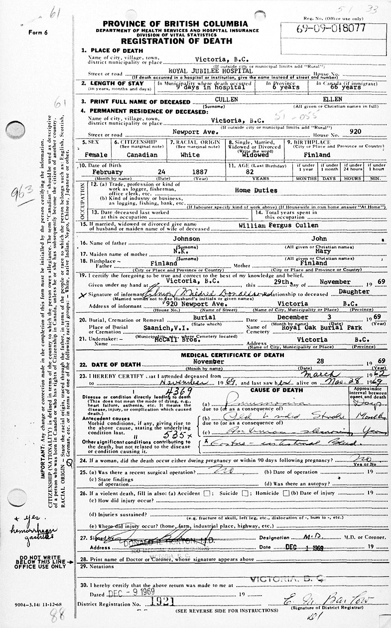June 30, 1904, in Kashabowic, Thunder Bay Co., Thunder Bay Dist., Ontario, Canada.