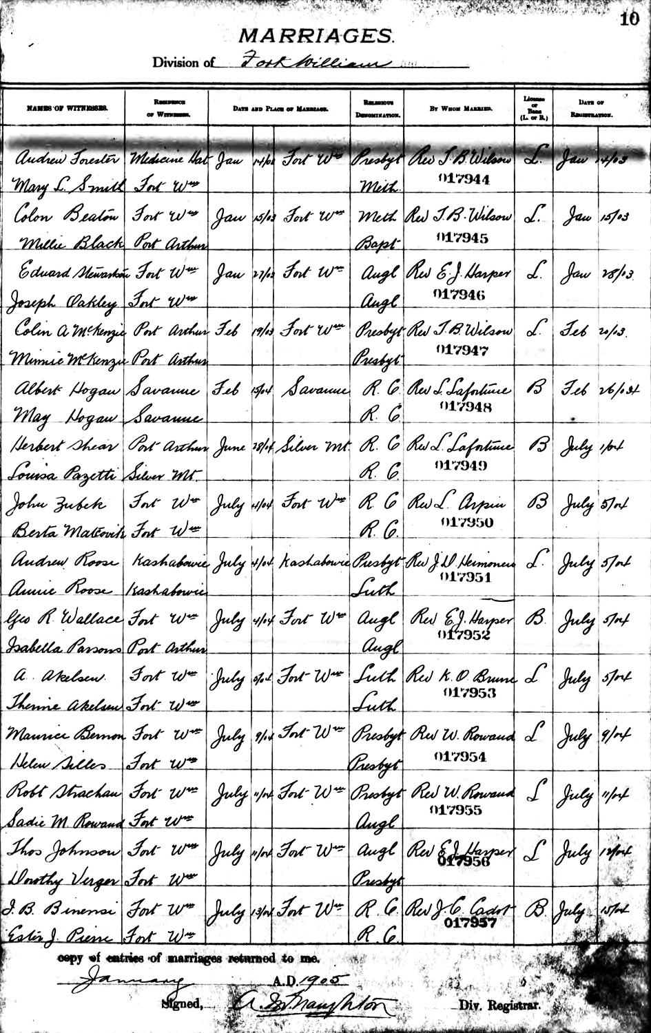 Ellen Ester Johnson were married July 1, 1904, in Kashabowic, Thunder Bay Co., Thunder Bay Dist.,