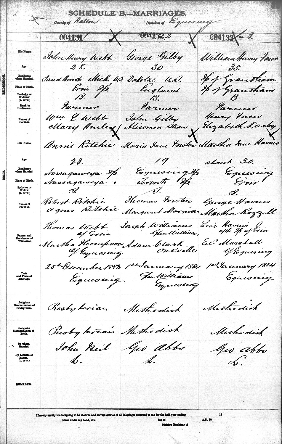 January 1, 1884, in Glen Williams, Halton Co., Ontario, Canada.